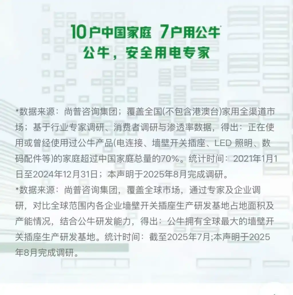 你觉得公牛的广告语:“10 户中国家庭,7 户用公牛”。是真的吗? 我倒是用公牛,因为早年被他的广告洗脑了。但是我绝不相信。 近期有同行质疑公牛的广告“大字吹牛、小字免责”,遭到公牛起诉索赔420万元。 广东中山市家的电器有限公司称:“10户中国家庭,7户用公牛”的广告语在跨品类场景中广泛使用时,未明确限定数据适用范围与统计数据,易导致消费者对公牛集团多品类产品的市场占有率产生误解。家的公司相关表述基于对广告宣传合规性的合理质疑,属于正常的市场观察范畴。 对于这句宣传语,公牛也有说明:“数据来源:尚普咨询集团;覆盖全国(不包含港澳台)家用全渠道市场;基于行业专家调研、消费者调研与渗透率数据,得出:正在使用或曾经使用过公牛产品(电连接、墙壁开关插座、LED 照明、数码配件等)的家庭超过中国家庭总量的70%。统计时间:2021年1月1日至2024年12月31日;本声明于2025年8月完成调研。”