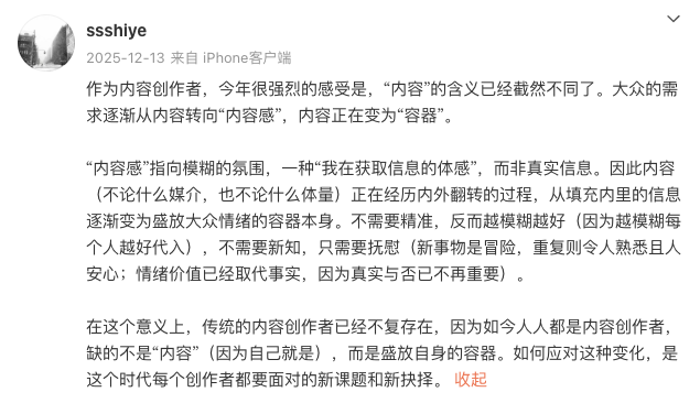 分享一个很受启发的观点,大意是:内容正在成为容器,盛放人们的情绪。 大家“不需要新知,只需要抚慰”;不需要真实信息,只需要一种“我正在获取信息的体感”。 多震撼,内容人的工作价值越发稀薄,可能更多变成了——为人们提供一面照见自己、自赏自怜的镜子。 广告也是这样。反响好的广告基本都是接住了热梗,接住了人们的情绪,真正讨论“公共议题”的广告越来越少,通常也反响寥寥。