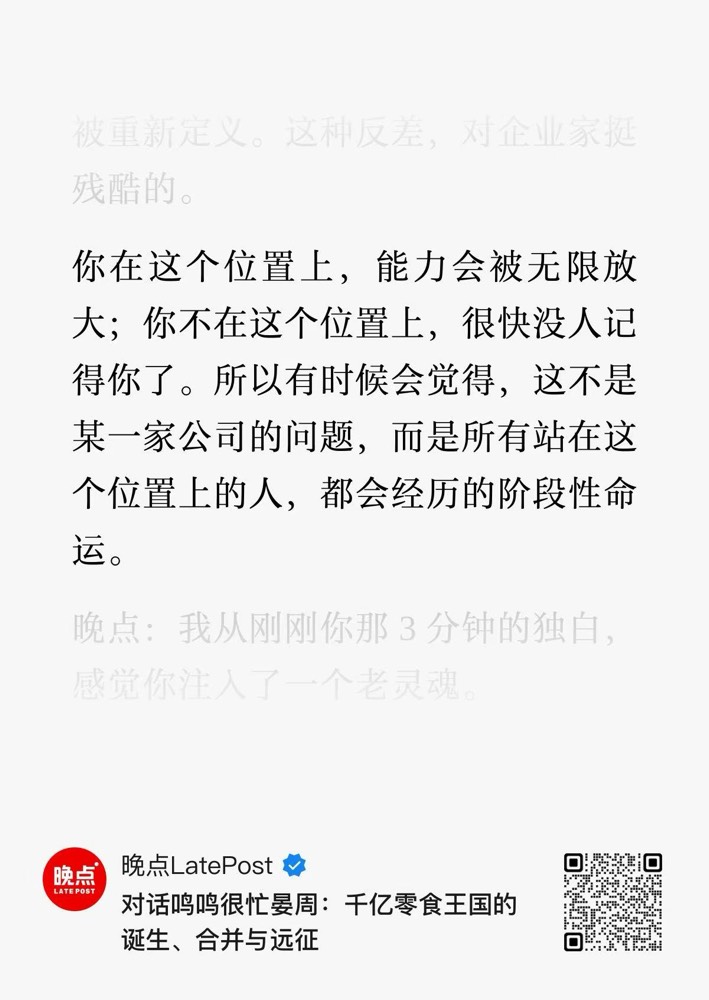 今天鸣鸣很忙上市,晚点访谈已经出了。 一个土老板用最基本的常识和本能做生意,更难得的是,内心的自知,一切因缘和合,做成了并非我的功劳,失败了也不过如此。这点马东身上也有,产生一种不自傲、不老登的心性