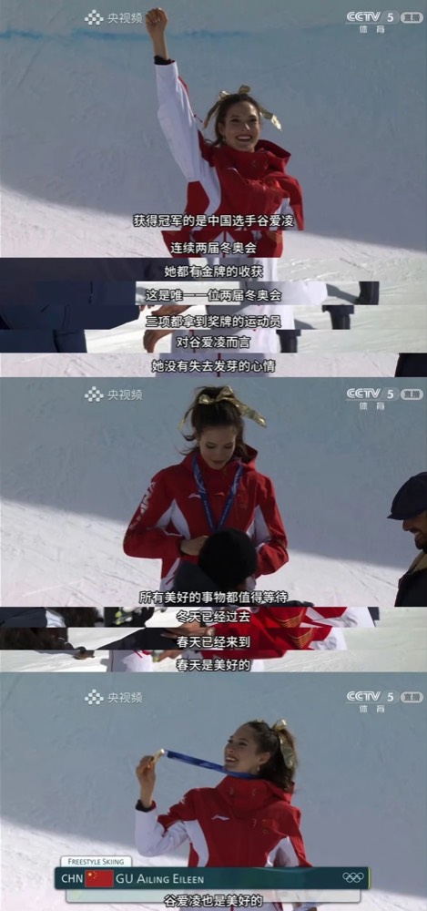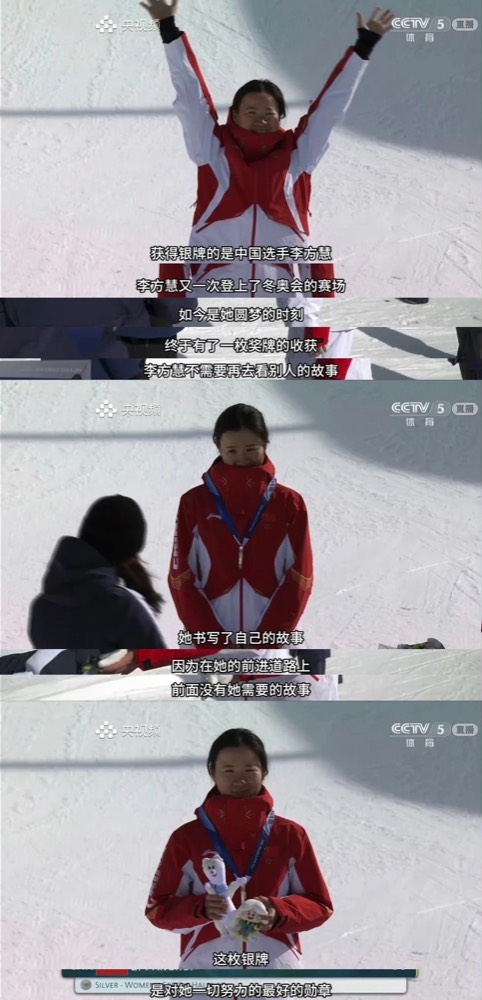 谷爱凌夺冠,央视女解说麦孜燕,哽咽了。她的这些话简直可以做蒙牛的文案: “4位中国女将给大家展现出了中国女人身上的力量。 中国女人不是天生要强, 我们是天生就很强。” 还有对银牌选手李方慧的祝福,这是一种对自我与命运的理解。 “如今是李方慧的圆梦时刻,她不需要再看别人的故事。 因为在她的路上,前面没有她需要的故事。”