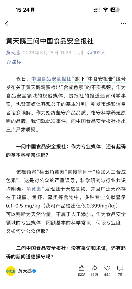 如果不是对自家产品有绝对的信心,没有哪个品牌敢这么硬刚官媒。 黄天鹅三问: 1、作为专业媒体,你连基本科学常识都没有吗? 2、没有任何采访求证,你还有起码的新闻道德吗? 3、刻意造谣传谣,你还有起码的法治观念吗?