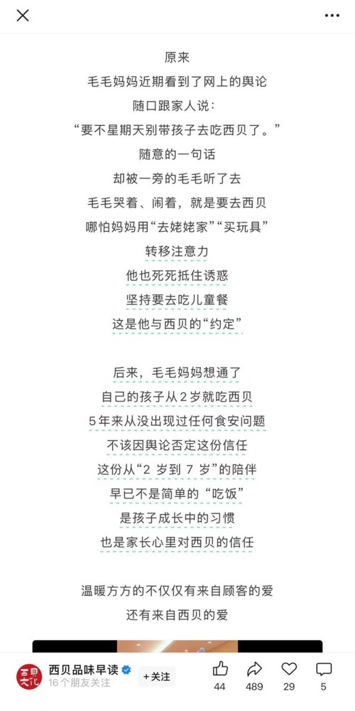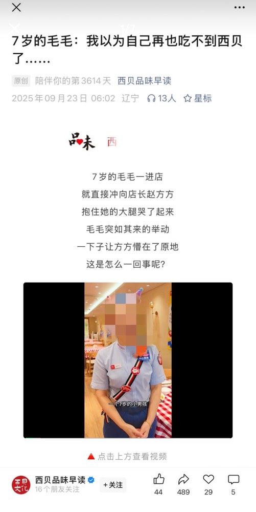 西贝官方公众号发布温情文章《7岁的毛毛:我以为我再也吃不到西贝了》,引发舆论争议,最终于9月25日删除该文。