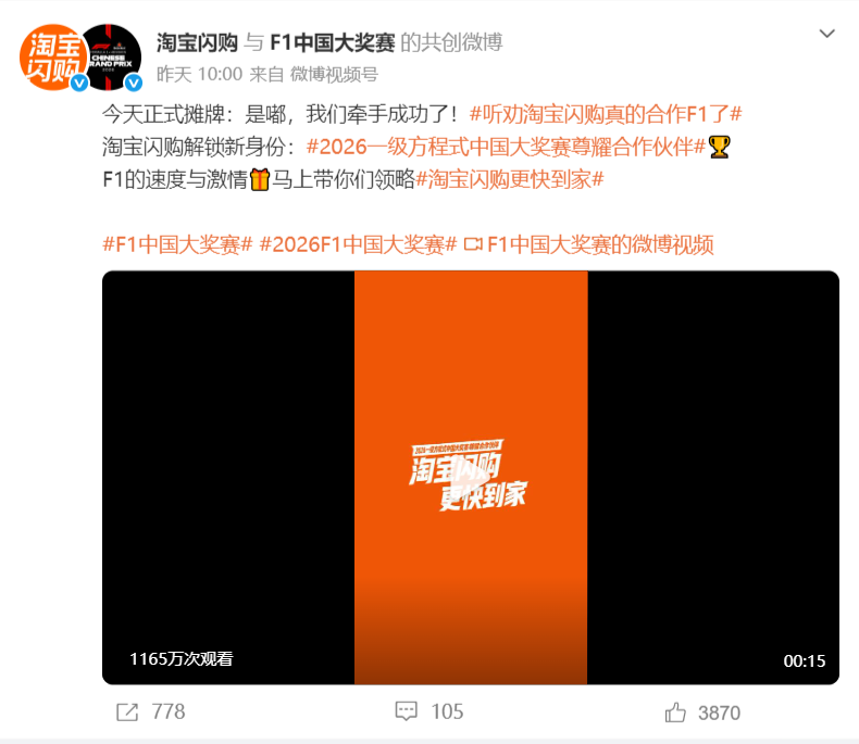 这会F1中国大奖赛开始在即,淘宝闪购真的官宣了和F1的合作