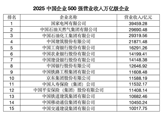 2025中国企业500强榜单发布,京东成为前十之中唯一的民营企业,收入超万亿。
