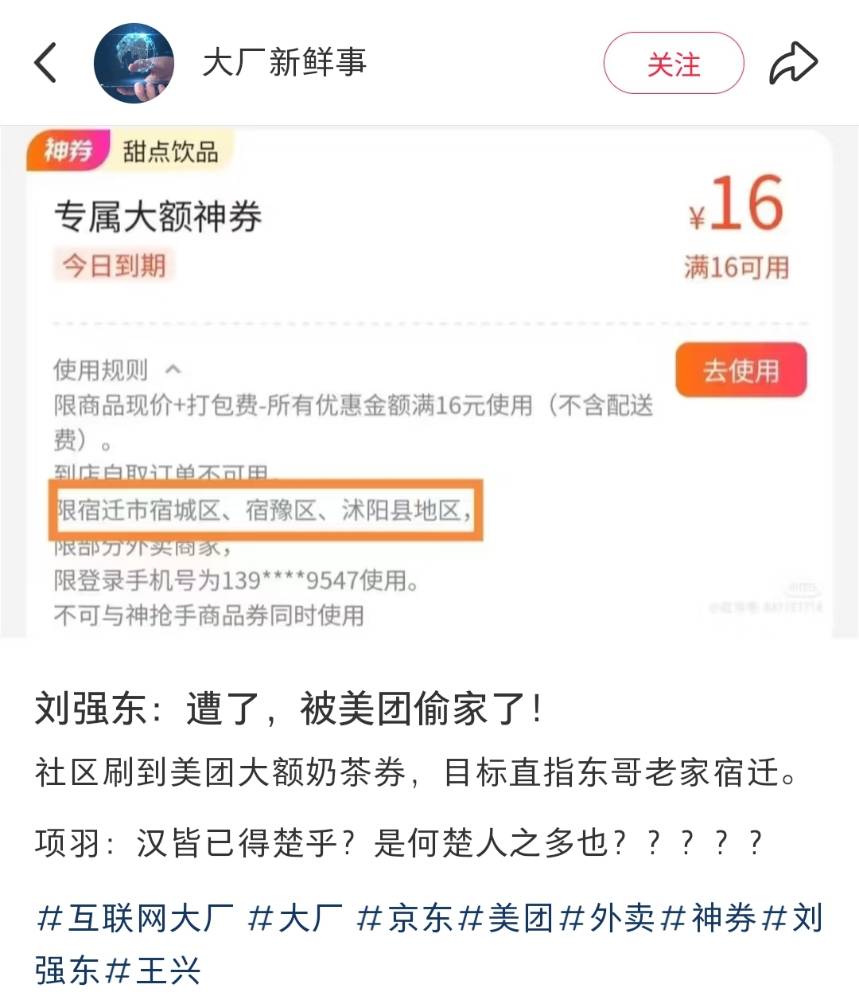 笑鼠了,有网友发现自己的美团大额券,目标直指东哥老家宿迁。