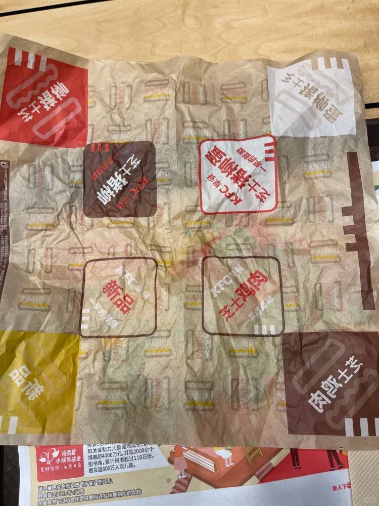 油纸摊开,一张涵盖多种汉堡品类,只需要在折叠的时候把汉堡先对准上面印有相应名字的那个方块就行。