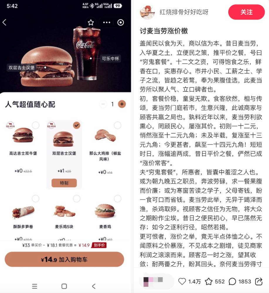温水煮青蛙之,这已经是麦当劳今年第二次涨价,3年涨了4次。谁还记得一开始是11.9啊。