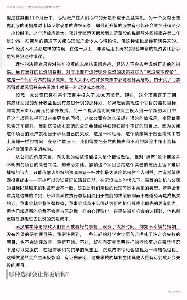 【每日一读-20250502-day.1164】理性的决策者只会对当前投资的未来结果感兴趣。后悔是一种情绪,也是一种自我惩罚。人们做出的许多决策都是因为不想后悔(“不要这样做,否则你会后悔的”是个非常常见的警告)。后悔是由替代现实的可用性引发的反事实情绪。决策制定者容易感到后悔,而痛苦的情绪则对很多的决策制定都有影响。... 展开