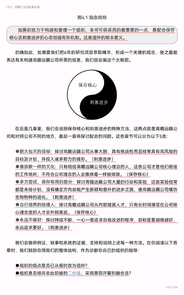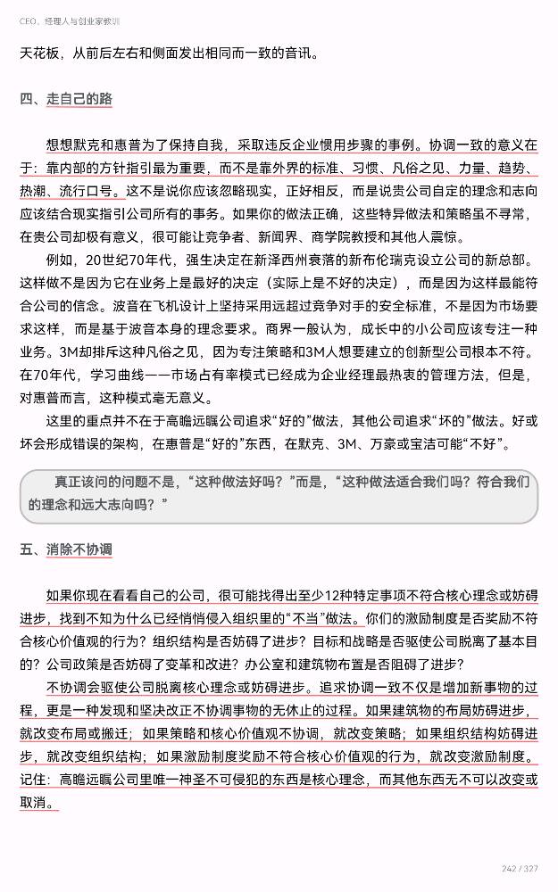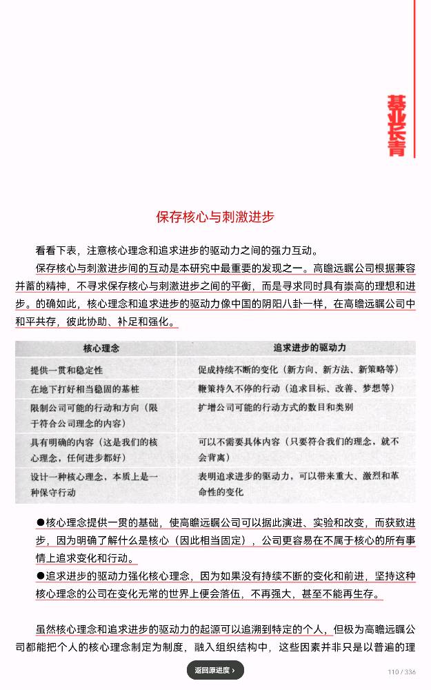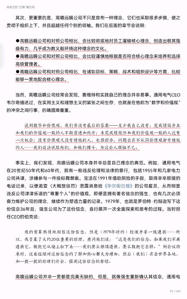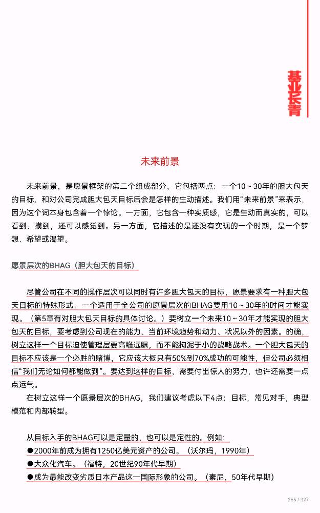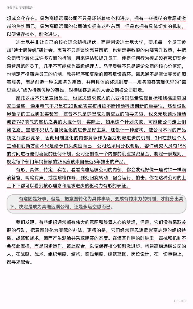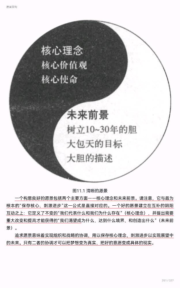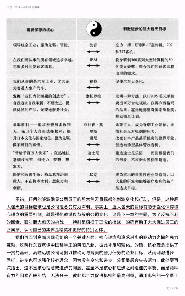 【每日一读-20250604-day.1170】“使命、价值观和指导方针”把人员和产品列在利润之前,而且强调改善质量、员工参与和顾客满意是重中之重。高瞻远瞩公司不是依靠单独一种规划、战略、战术、机制、文化标准、象征性的姿态或CEO的演讲来保存核心和刺激进步,重要的是依靠整体素质。追求愿景意味着实现组织和战略的协调,用以保存核心理念,刺激进步以实现展望中的未来。只有二者的协调才可以把梦想变为真实,把好的意愿变成具体的现实。... 展开