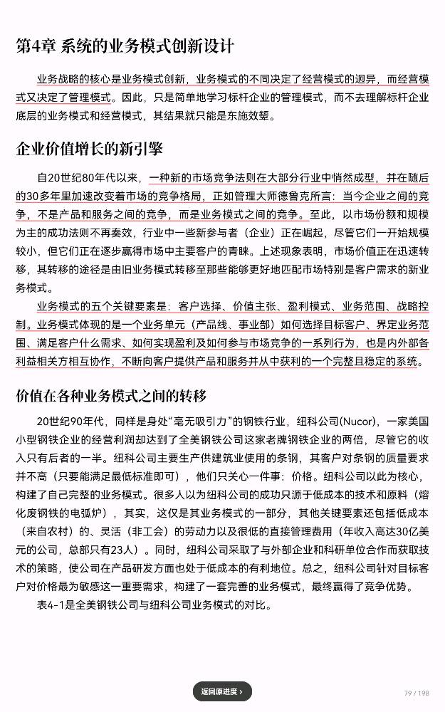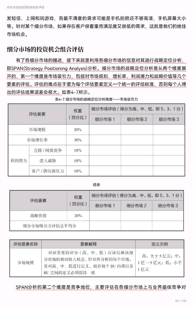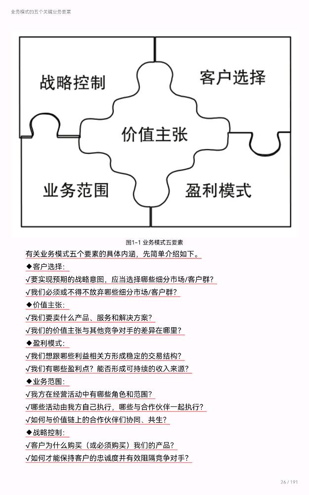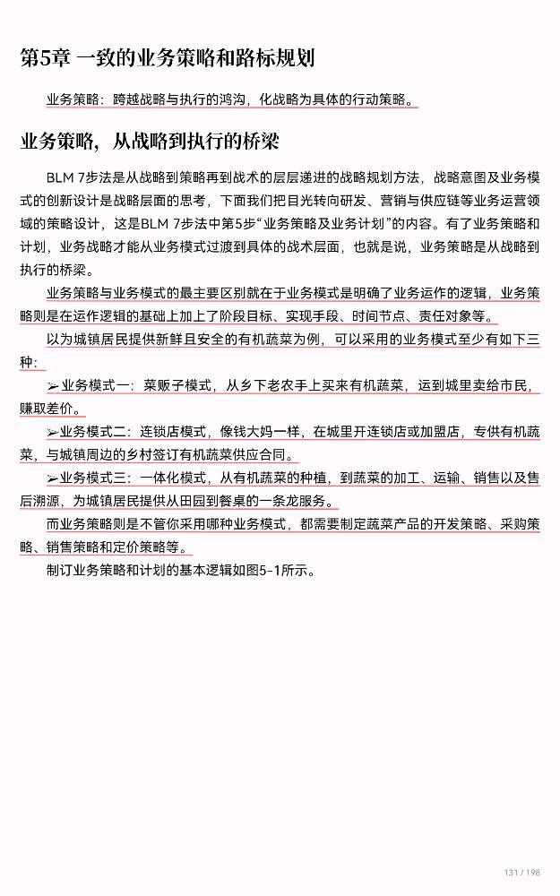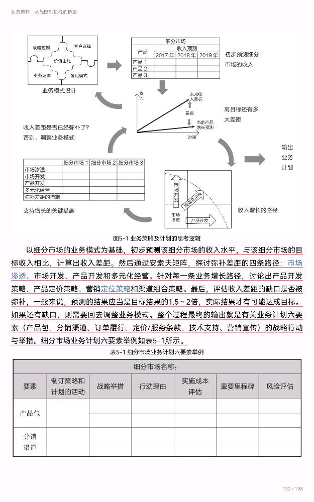 【每日一读-20250623-day.1173】业务战略的核心是业务模式创新,业务模式的不同决定了经营模式的迥异,而经营模式又决定了管理模式。业务模式的五个关键要素是:客户选择、价值主张、盈利模式、业务范围、战略控制。市场细分是企业根据客户需求的不同,把整个市场划分成不同的客户群的过程。业务策略:跨越战略与执行的鸿沟,化战略为具体的行动策略。业务策略与业务模式的最主要区别就在于业务模式是明确了业务运作的逻辑,业务策略则是在运作逻辑的基础上加上了阶段目标、实现手段、时间节点、责任对象等。以细分市场的业务模式为基础,初步预测该细分市场的收入水平,与该细分市场的目标收入相比,计算出收入差距。然后通过安索夫矩阵,探讨弥补差距的四条路径:市场渗透、市场开发、产品开发和多元化经营。针对每一条业务增长路径,讨论出产品开发策略、产品定价策略、营销定位策略和渠道组合策略。... 展开