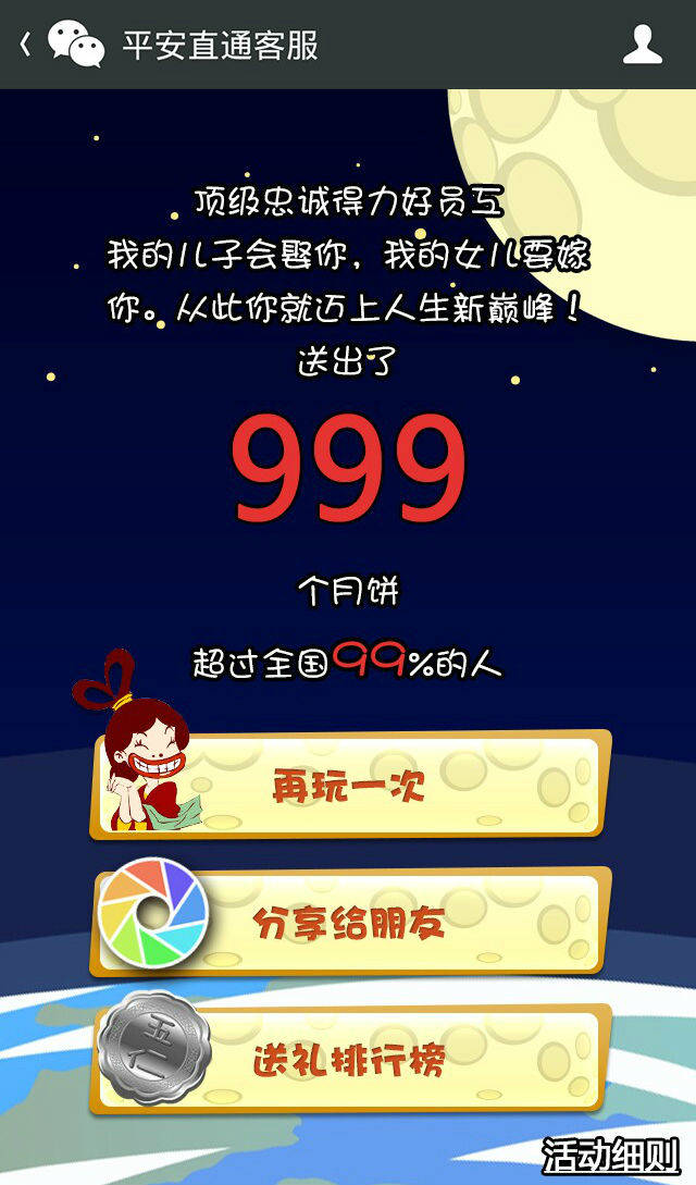 游戏的分享机制在这里也值得强调一下,微信游戏说到底怎么能少了用户与朋友们的互相竞争和攀比呢?正是分享之后的竞争机制才使游戏具备了更强的传播性和娱乐性,所以这款游戏同样设置了分享机制,并且【平安直通客服】还为优秀的玩家准备了丰厚的奖品,使游戏的竞技性更加强烈。