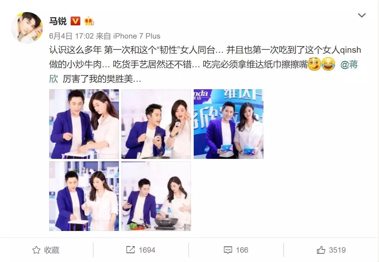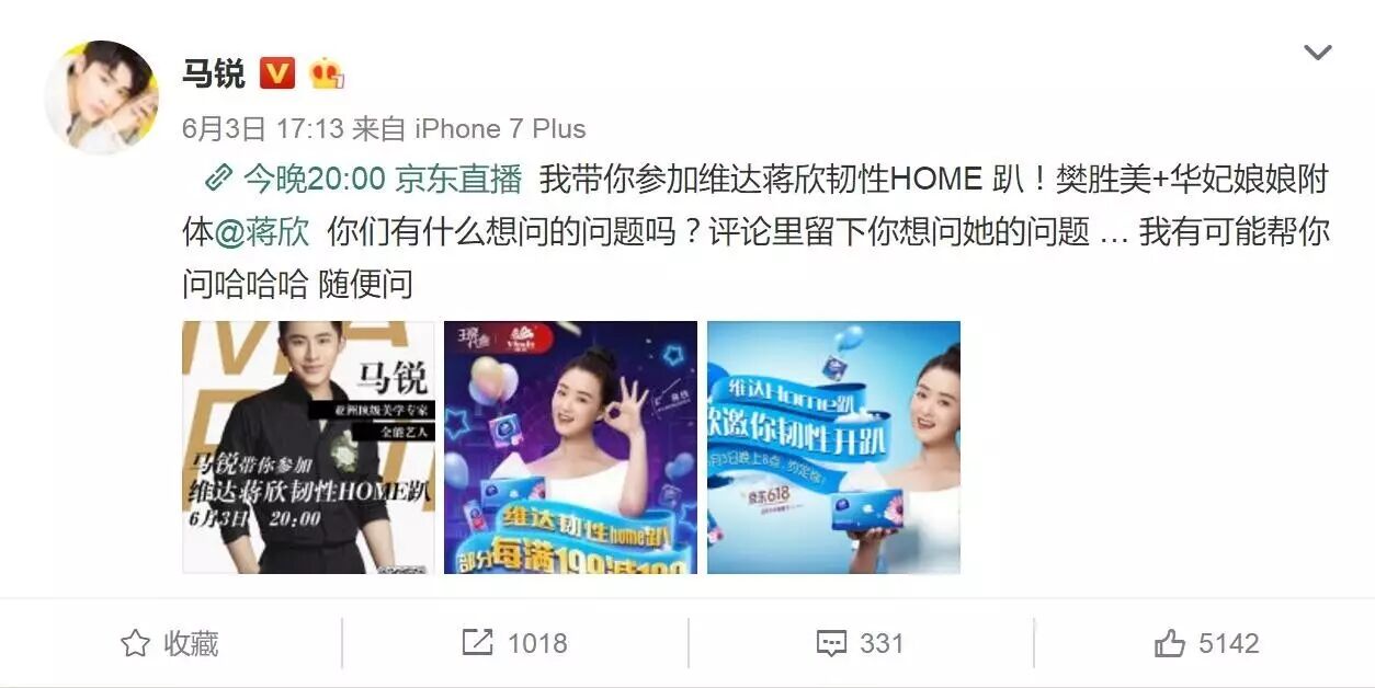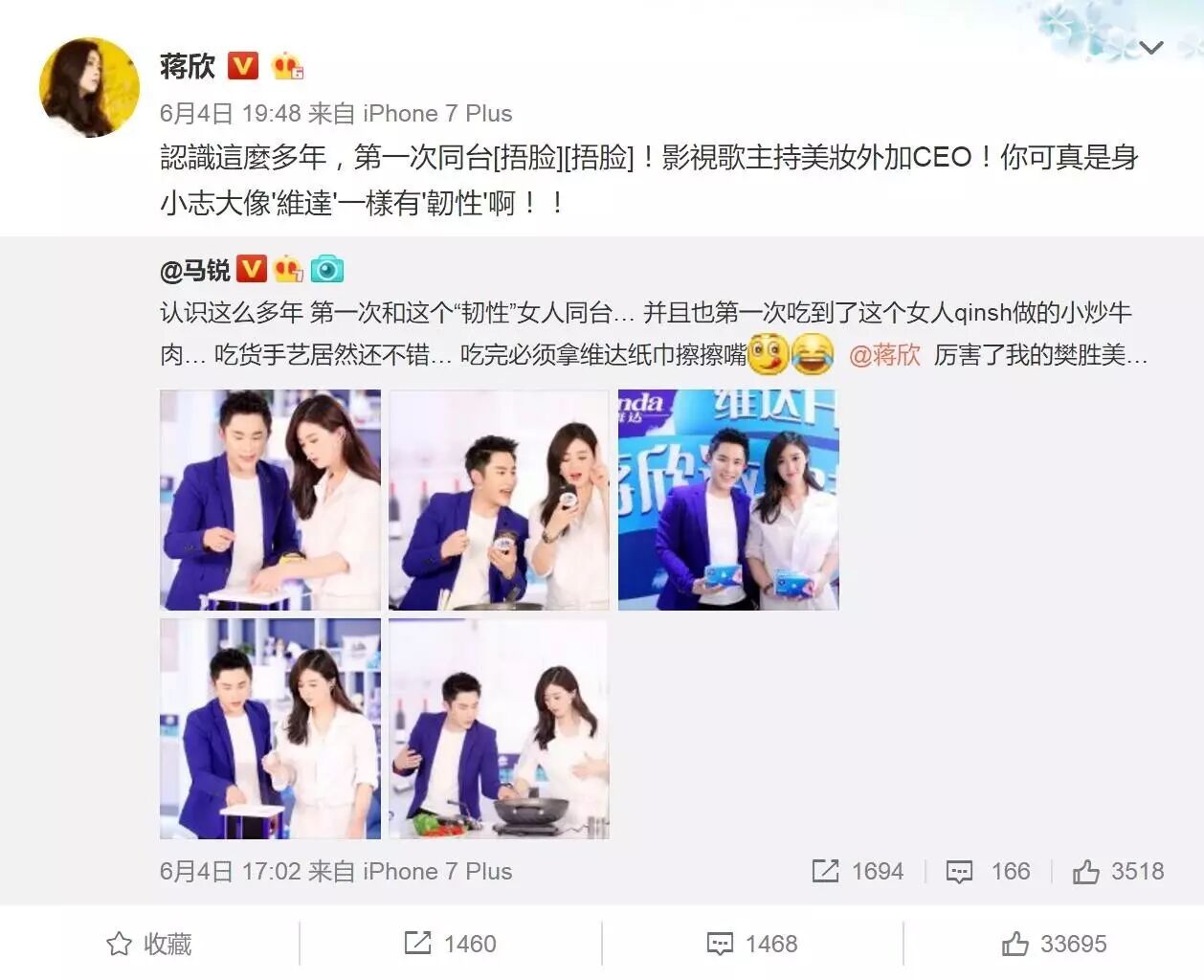直播结束后主持人马锐和蒋欣在微博平台就“第一次同台”话题展开了自发互动,并感谢品牌,进一步强化了品牌推广的效果。