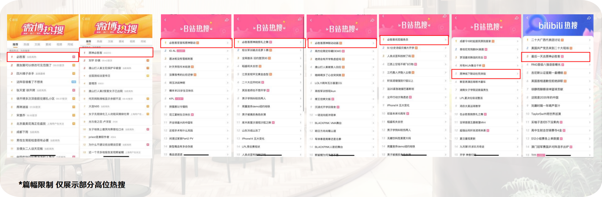 1、联动自官宣起多次霸榜微博及B站热搜榜单,2次登顶微博热搜第1位(纯自然流量),4次登顶B站热搜(纯自然流量),联动机制、官方素材、玩家整活内容多维多面屡屡上榜;