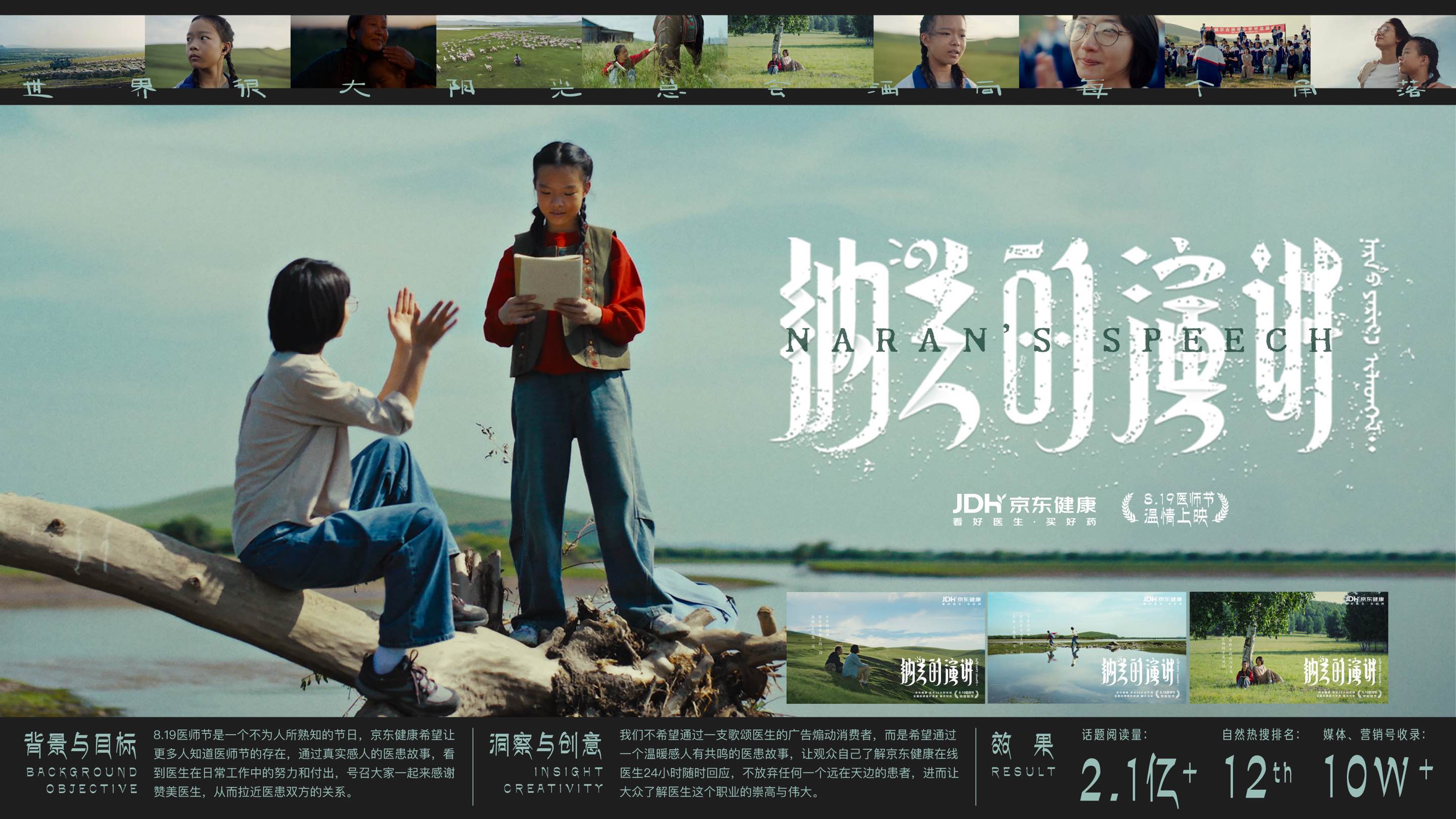 我们选取了京东健康上的真实医患案例,将其改编为短片《纳兰的演讲》,这个故事与心理疾病相关,很好地体现了互联网医院在促进医疗资源普及方面的价值。