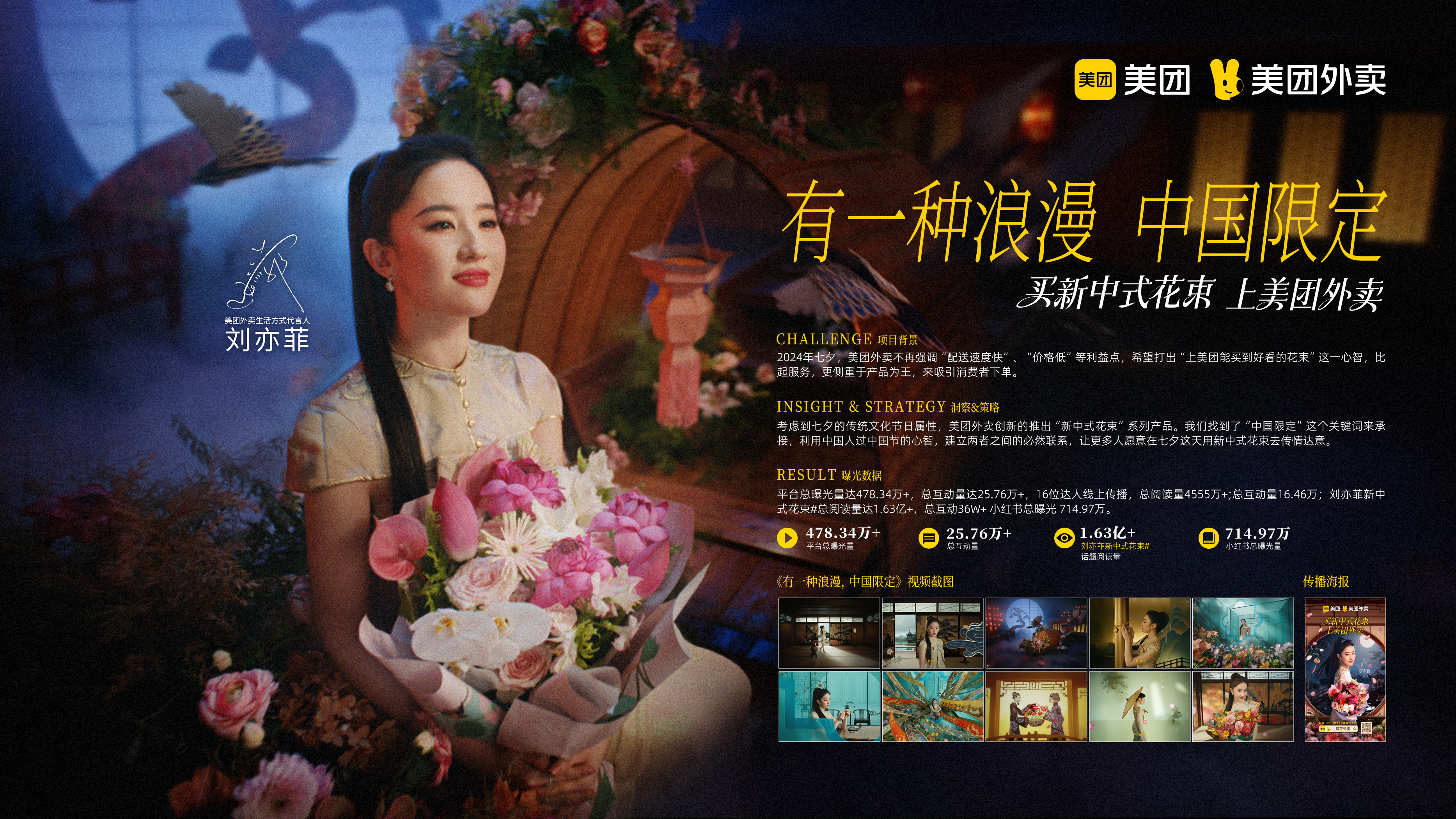 我们考虑到七夕的传统文化节日属性,美团外卖创新的推出“新中式花束”系列产品。我们找到了“中国限定”这个关键词来承接,利用中国人过中国节的心智,建立两者之间的必然联系,让更多人愿意在七夕这天用新中式花束去传情达意。