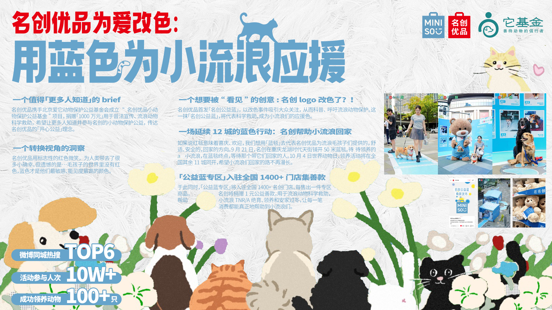 名创优品首发「名创公益蓝」,以改色事件吸引大众关注,从而科普、呼吁流浪动物保护。这一抹「名创公益蓝」,将代表科学救助,成为小流浪们的应援色。