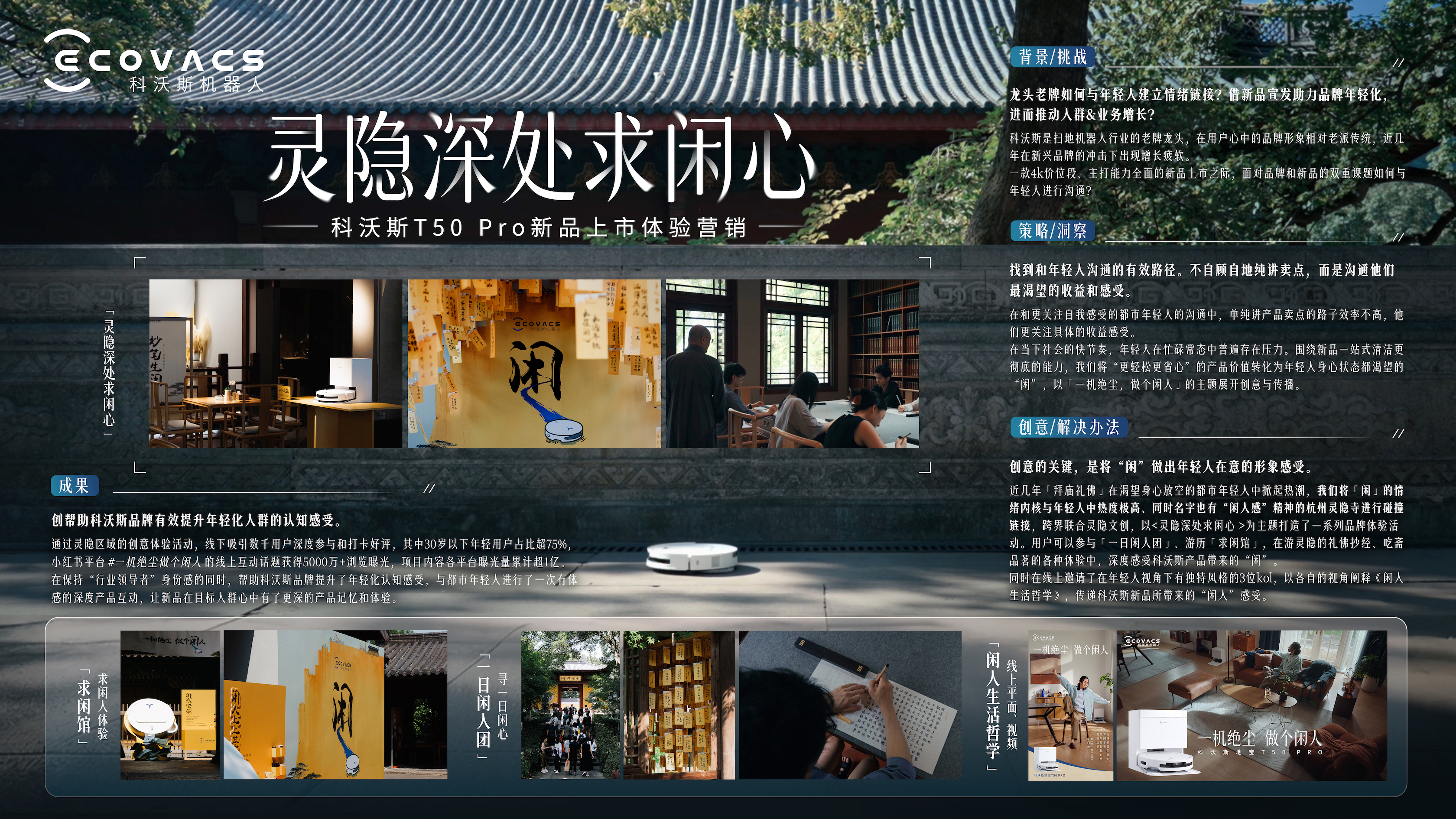 近几年「拜庙礼佛」在渴望身心放空的都市年轻人中掀起热潮,我们将「闲」的情绪内核与年轻人中热度极高、同时名字也有“闲人感”精神的杭州灵隐寺进行碰撞链接,跨界联合灵隐文创,以<灵隐深处求闲心 >为主题打造了一系列品牌体验活动。用户可以参与「一日闲人团」、游历「求闲馆」,在游灵隐的礼佛抄经、吃斋品茗的各种体验中,深度感受科沃斯产品带来的“闲”。