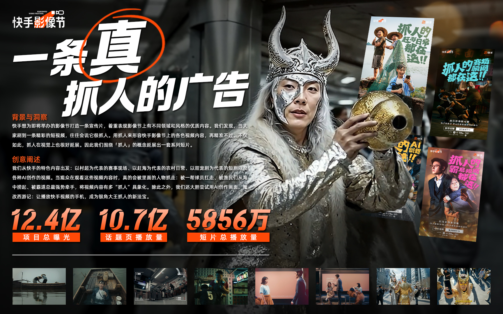 从抓人这个关键词出发,我们给快手影像节写了一句slogan:抓住影像新可能。再然后呢,客户、我们和刘峰导演像说好了似的,都不想拍manifesto video,于是才有了大家看到的这几条轻松诙谐的小片。