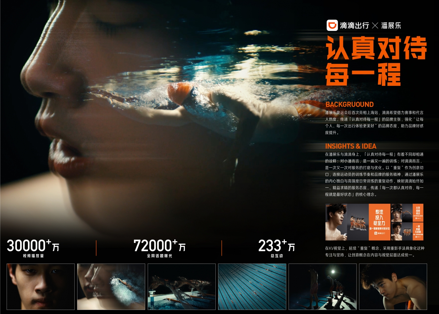 在潘展乐与滴滴身上,「认真对待每一程」 有着不同却相通的诠释:对小潘而言,是一遍又一遍的训练;对滴滴而言,是一次又一次对服务的打磨与优化。以”重复”作为创意切口,连接运动员的训练书奏和品牌的服务精神,通过潘展乐的内心独白与高强度日常训练的重复动作,映射滴滴始终如一、精益求精的服务态度,传递「每一次都认真对待,每一程就是最好状态」的核心理念。