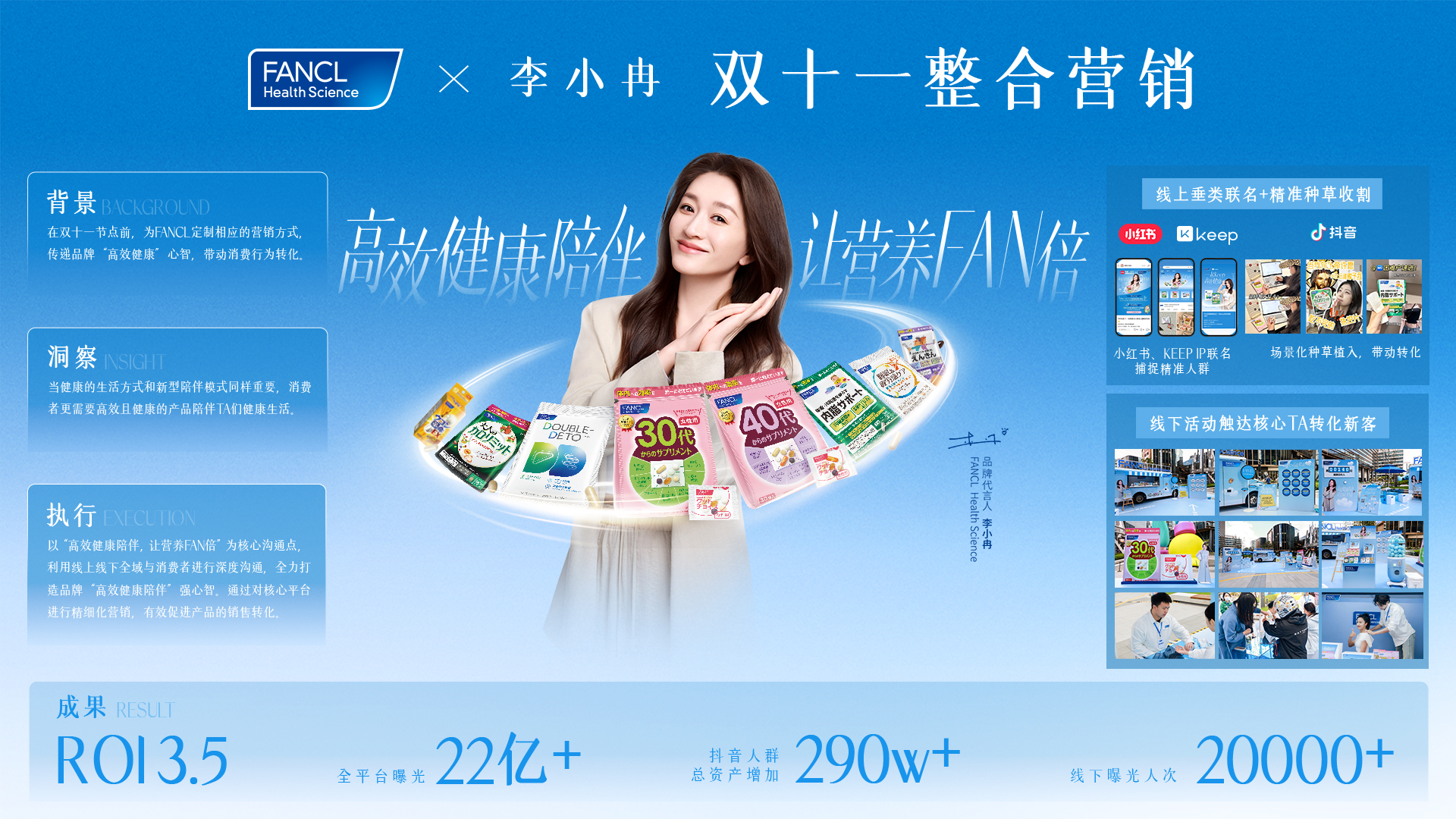 这个双十一,我们携手FANCL以“高效健康陪伴,让营养FAN倍”为核心沟通点,利用线上线下全域与消费者进行深度沟通,全力打造品牌“高效健康陪伴”强心智。通过对核心平台进行精细化营销,有效促进产品的销售转化。