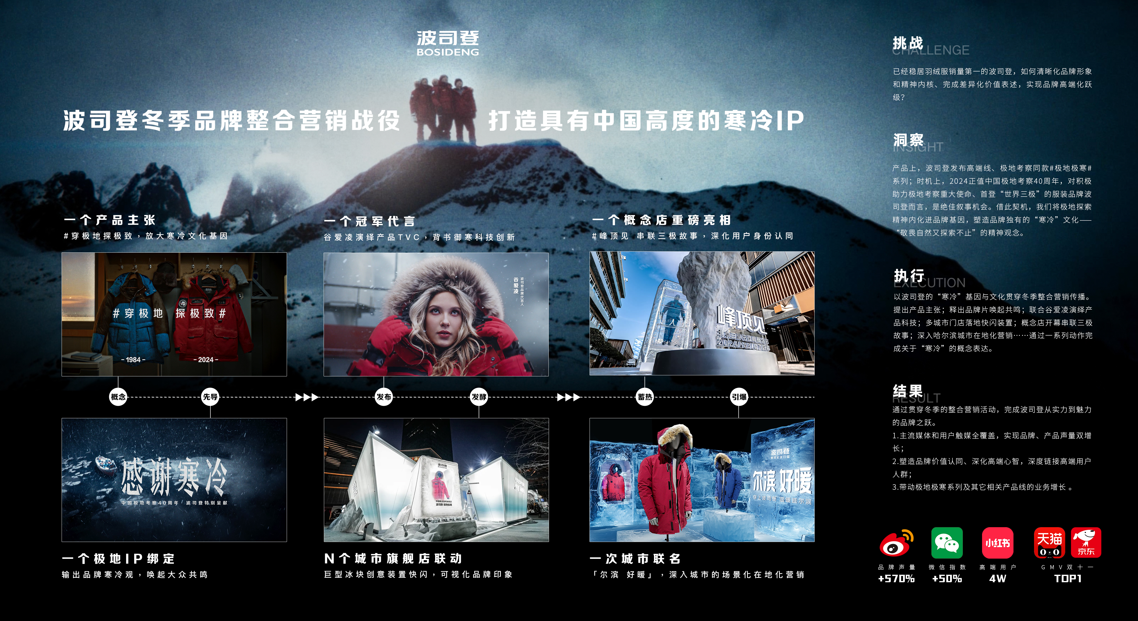 策略:将极地探索精神内化进品牌基因,塑造品牌独有的“寒冷”文化——“敬畏自然又探索不止”的精神观念。由此,不仅提炼出#穿极地探极致#的产品主张,同时进行线上线下的一系列品牌沟通和传播活动,扩大势能并有效强化用户心智。