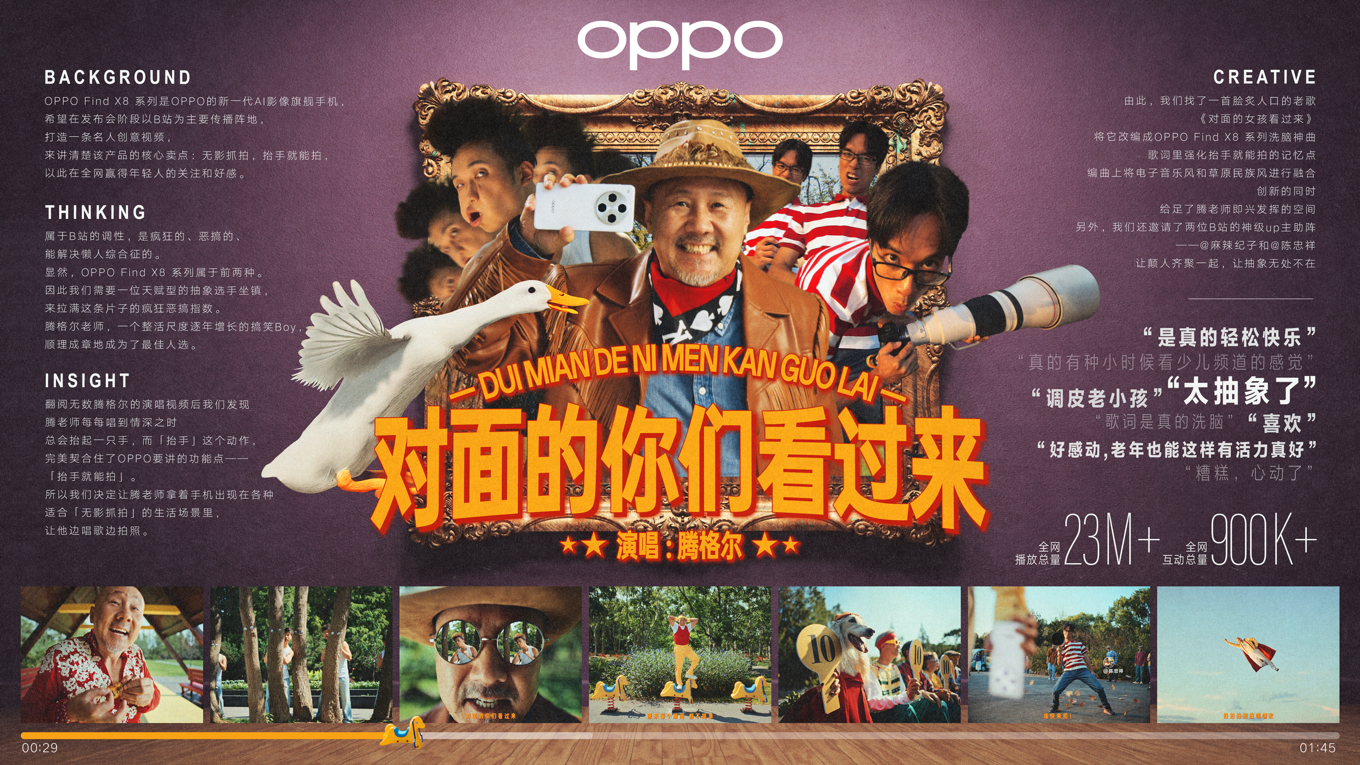 为了帮助推广OPPO Find X8的新功能「无影抓拍,抬手就拍」,我们找来了最会整活的@腾格尔老师,并把脍炙人口的老歌——《对面的女孩看过来》,改编成无影抓拍洗脑神曲——《对面的你们看过来》。在歌词里,强化抬手就能拍的记忆点;编曲上将电子音乐风和草原民族风进行融合,产生魔性旋律。在B站传播的mv中,邀请了两位神级up主助阵——人形镜头校准器@麻辣纪子和怪咖摄影师@陈忠祥,与腾格尔老师来了一场抓拍PK赛,场面看似混乱,但腾格尔凭借OPPO无影抓拍功能轻松取胜。颠人齐聚一起,抽象登顶b站热门。