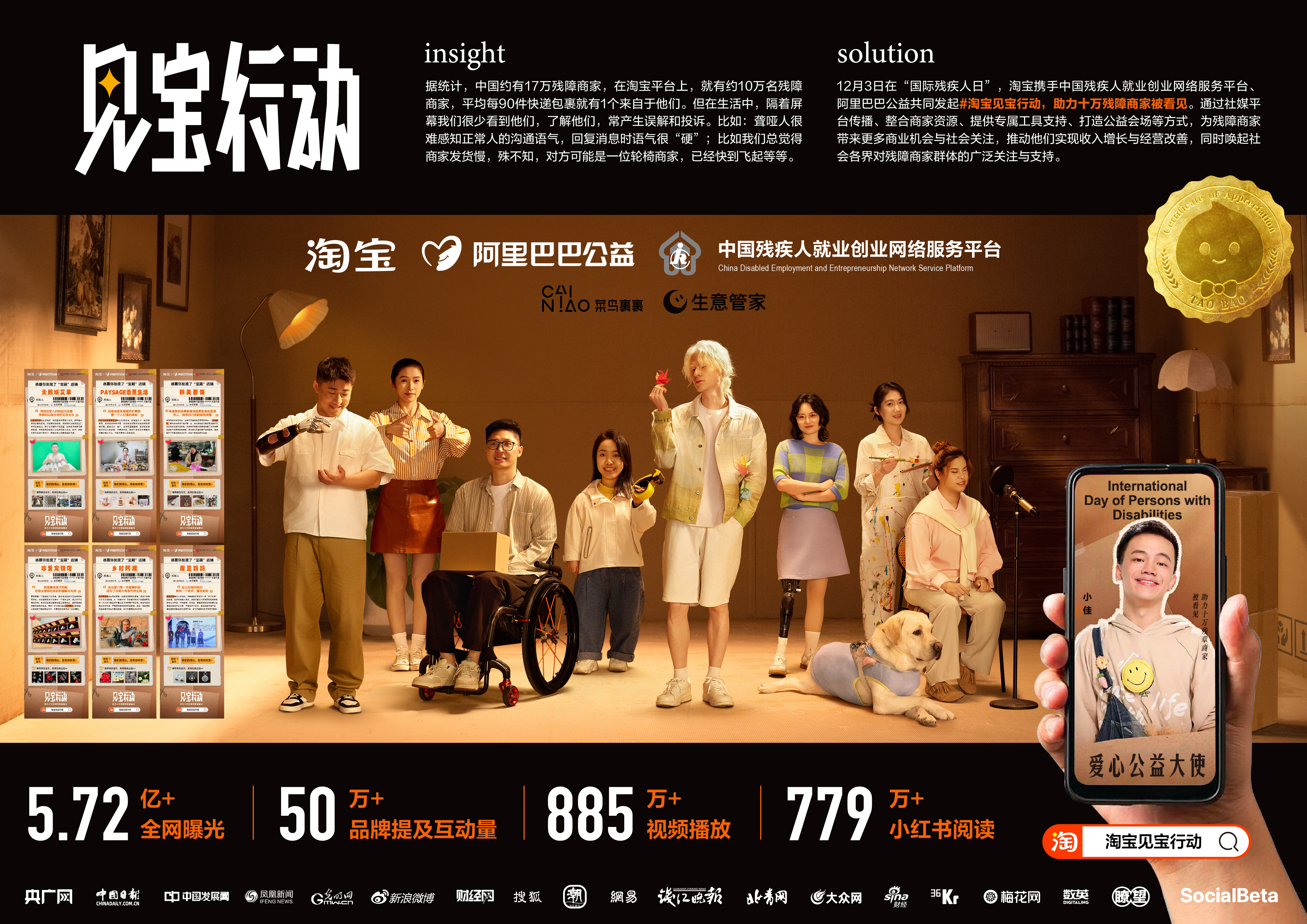 12月3日为“国际残疾人日”,淘宝携手中国残联就业服务平台、阿里巴巴公益共同发起淘宝「见宝行动」。通过社媒平台传播、整合商家资源、提供专属工具支持、打造公益会场等方式,为残障商家带来更多商业机会与社会关注,推动他们实现收入增长与经营改善,同时通过此次公益活动唤起社会各界对残障商家群体的广泛关注与支持。