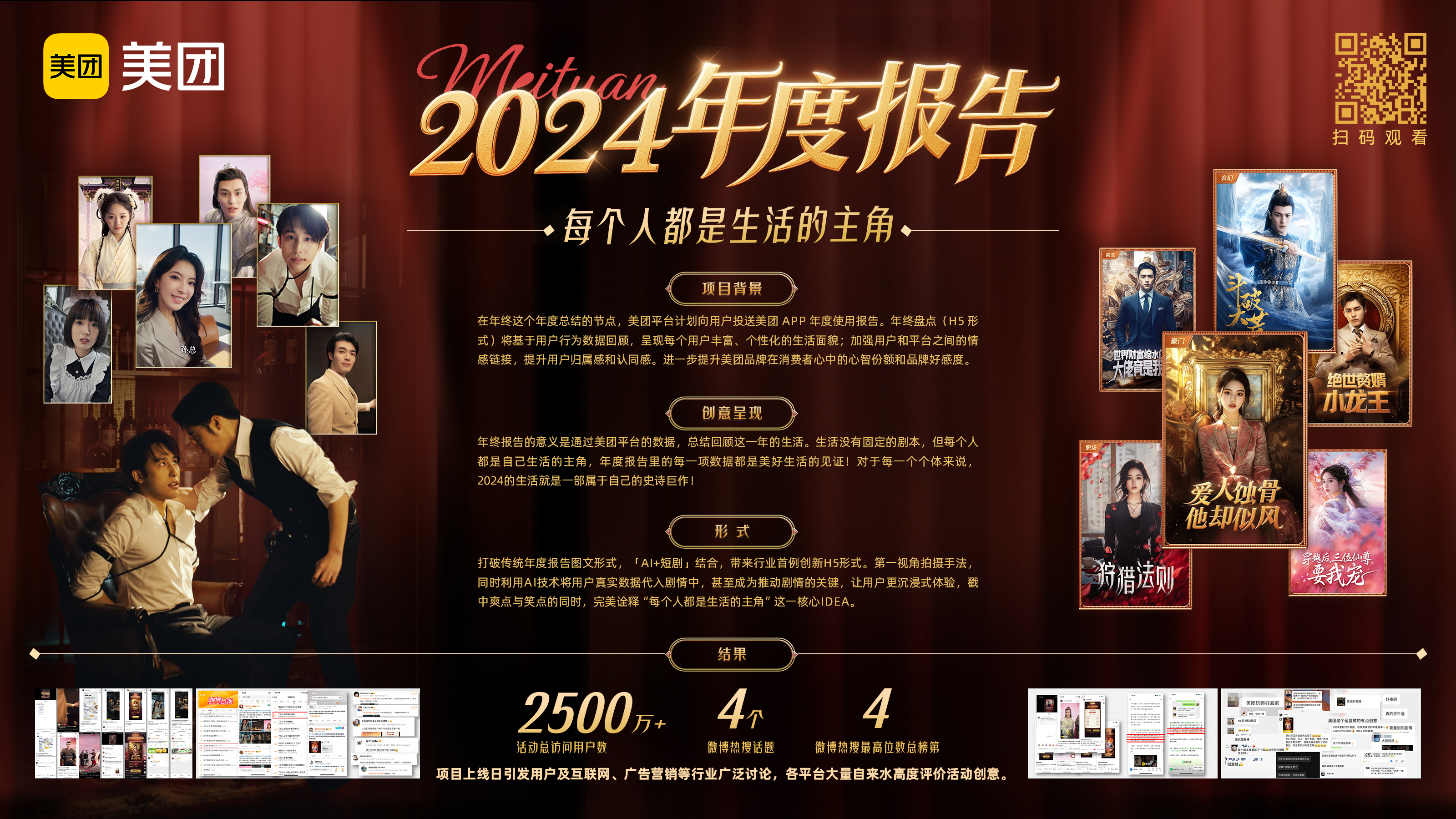 美团站内活动总访问用户数2500万+,微博热搜话题4个,微博热搜最高位数总榜第4。项目上线后引发用户及互联网、广告营销等行业广泛讨论,各平台大量自来水高度评价活动创意。