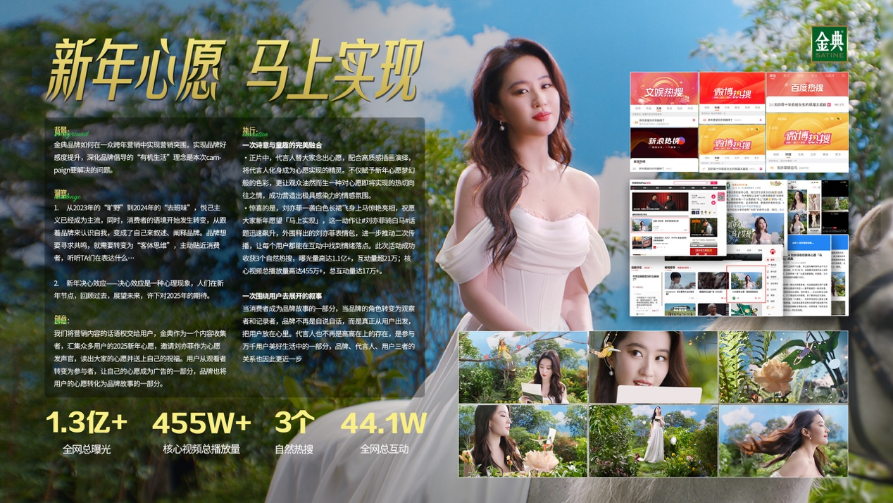 我们将营销内容的话语权交给用户,金典作为一个内容收集者,汇集众多用户的2025新年心愿,邀请刘亦菲作为心愿发声官,读出大家的心愿并送上自己的祝福。用户从观看者转变为参与者,让自己的心愿成为广告的一部分,品牌也将用户的心愿转化为品牌故事的一部分。