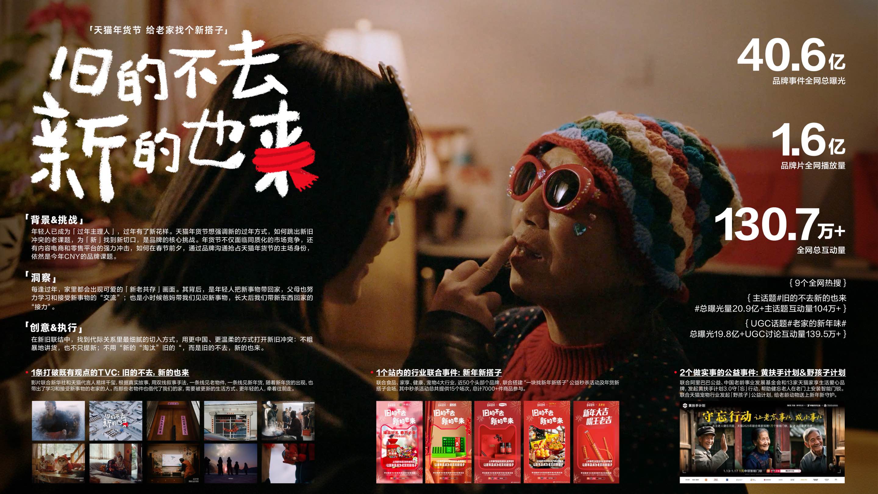品牌事件全网总曝光40.6亿+;总互动量130.7万;品牌片全网播放量1.6亿+;9个全网热搜;主话题#旧的不去新的也来#总曝光量20.9亿+,互动量104万+;UGC话题#老家的新年味#总曝光19.8亿+,UGC讨论互动量(含小红书)139.5万+。