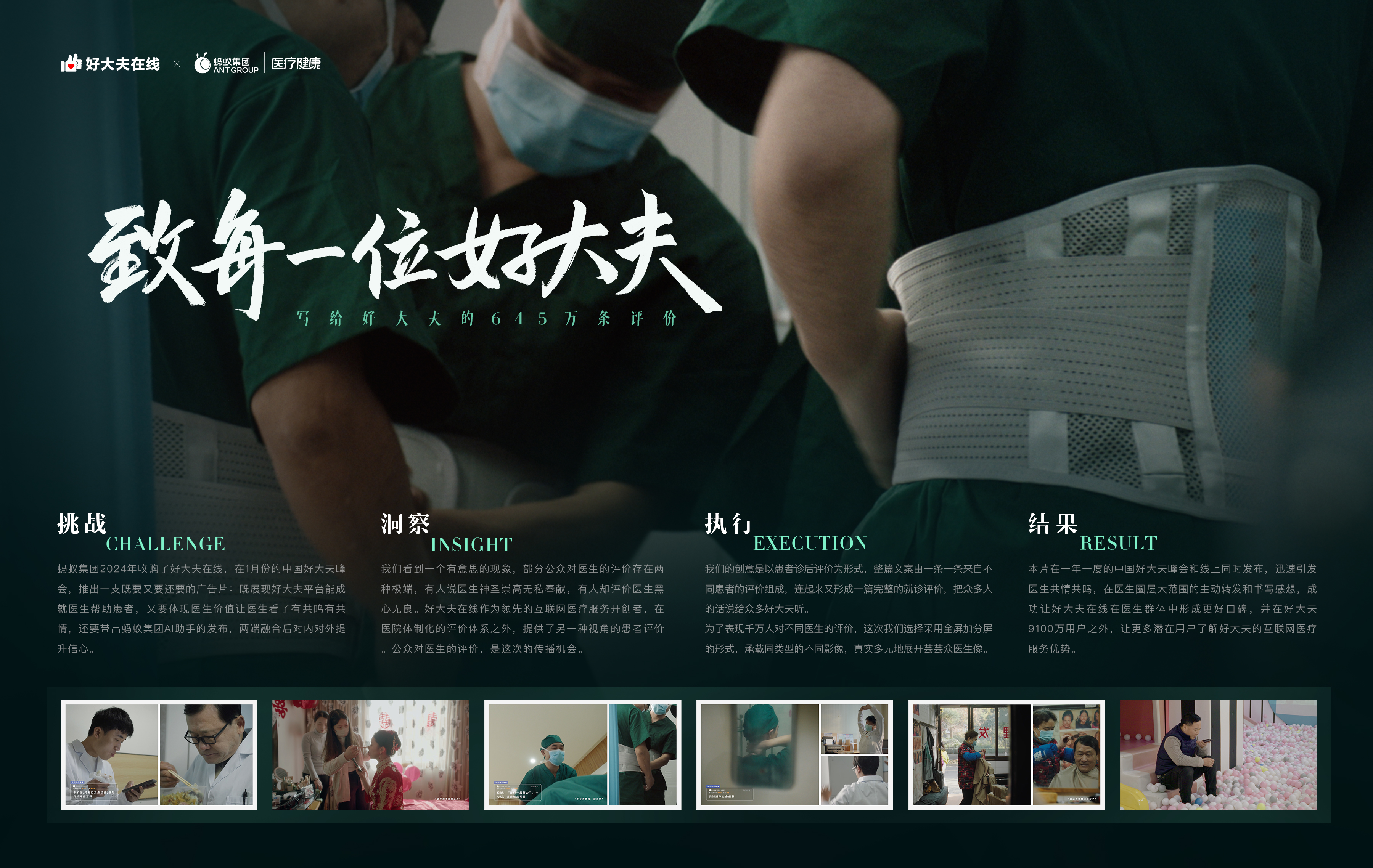 本片在一年一度的中国好大夫峰会和线上同时发布,迅速引发医生共情共鸣,在医生圈层大范围的主动转发和书写感想,成功让好大夫在线在医生群体中形成更好口碑。同时融合了传递平台价值、共鸣医生群体、带出战略业务信息等综合需求,面向垂直行业进行传播,并在好大夫9100万用户之外,让更多潜在用户了解好大夫的互联网医疗服务优势。