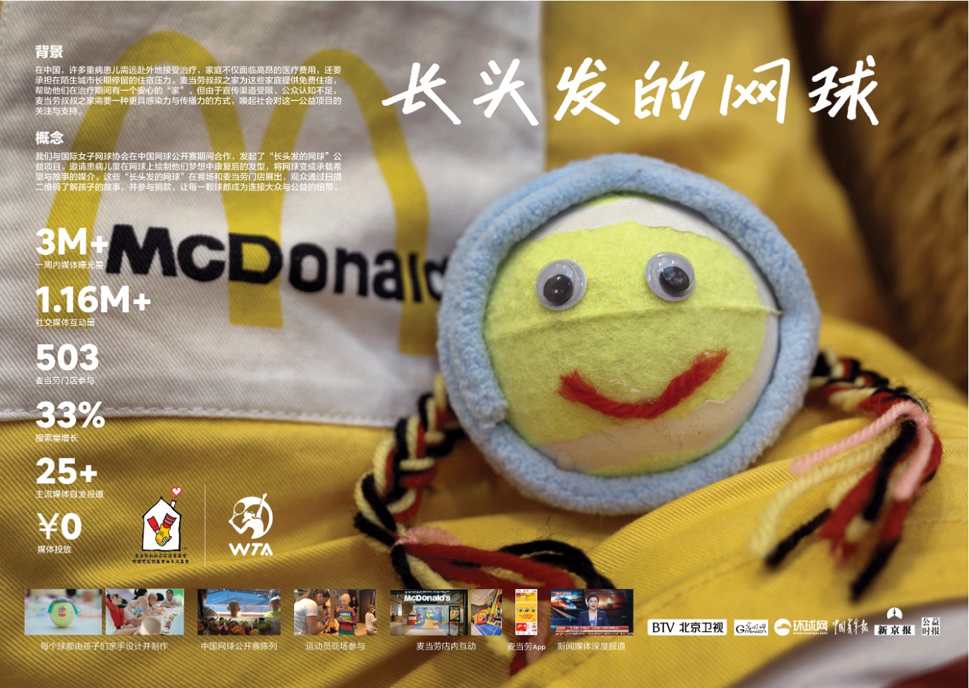 与此同时,我们拍摄了一部感人的公益案例影片《长头发的小网球》,记录了这个过程,以此向公众传递孩子们对康复和未来的美好期盼。影片将记录从孩子们的创作过程,到网球在赛场上展示,再到麦当劳店内的宣传活动,展示社会各界对孩子们的支持与关爱。
