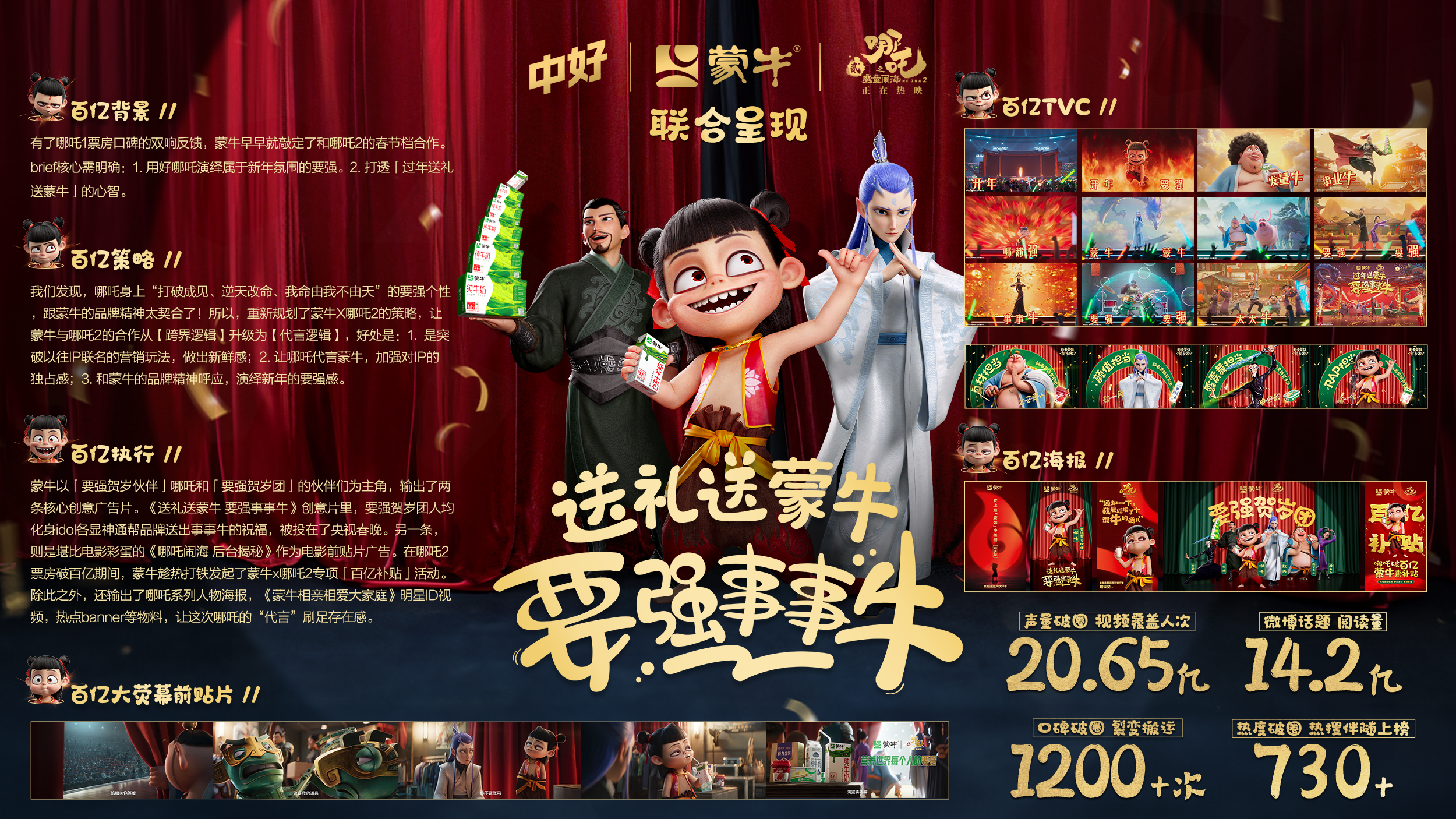 哪吒身上“我命由我不由天”的叙事内核,与蒙牛「要强」的品牌主张高度契合。同时春节礼赠场景中,牛奶又是高频刚需品,但缺乏情感附加值,于是结合「送礼场景」与哪吒&品牌「要强」的精神内核,推出蒙牛春节主张:送礼送蒙牛,要强事事牛。让哪吒2一众主演,化身蒙牛「要强贺岁团」,和蒙牛一起,为大家送出要强的祝福。