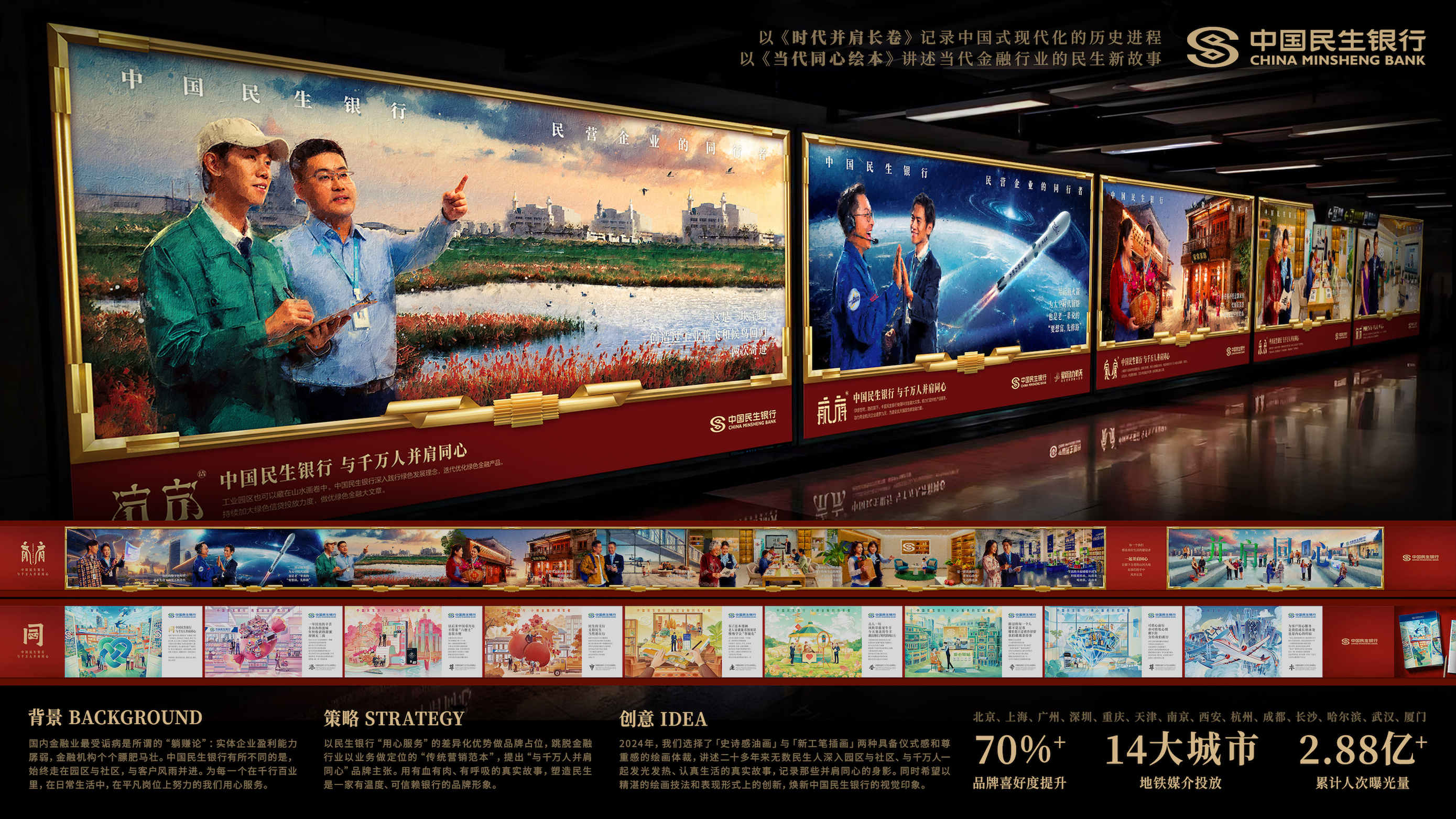 2024年国庆节前,第一轮的中国民生银行「史诗感油画」投放了北京、上海、广州、杭州、天津、成都、西安及厦门城市地铁媒介。其中,北京投放西单及王府井等核心商圈地铁站,上海投放陆家嘴地铁站等热门商圈。整体8个城市投放,据不完全统计,曝光总数达到1.88亿人次。北上区域投放,抽样调查显示,广告喜好度和好感提升人群占比均接近70%。