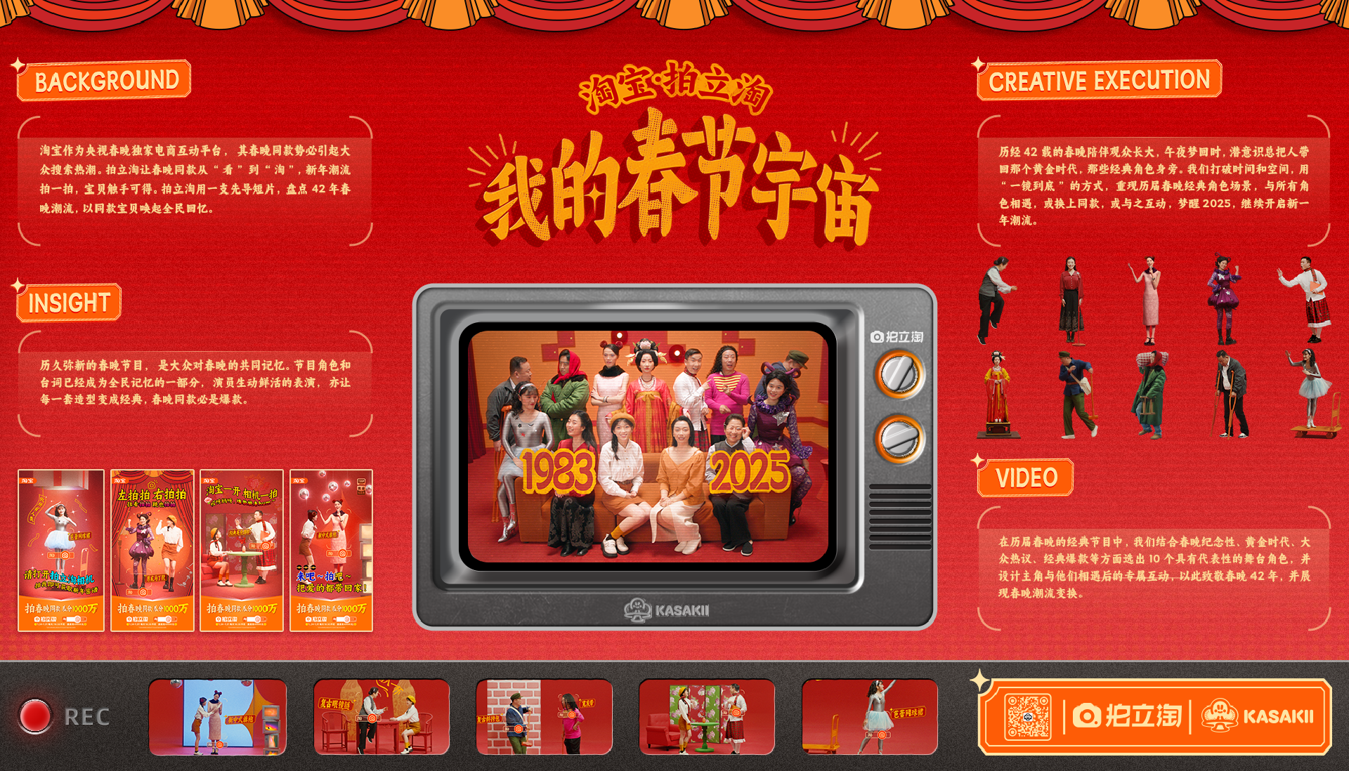 在25年春晚节点,用穿越42年的春晚时尚潮流,全面打开「拍立淘」春晚搜同款的使用场景联想。线上话题#淘宝拍立淘找春晚同款,话题阅读量达2.8亿次,高效拓宽产品曝光热度。内容全网观看次数达1300万+,掀起全民看春晚、拍春晚同款潮流热点。