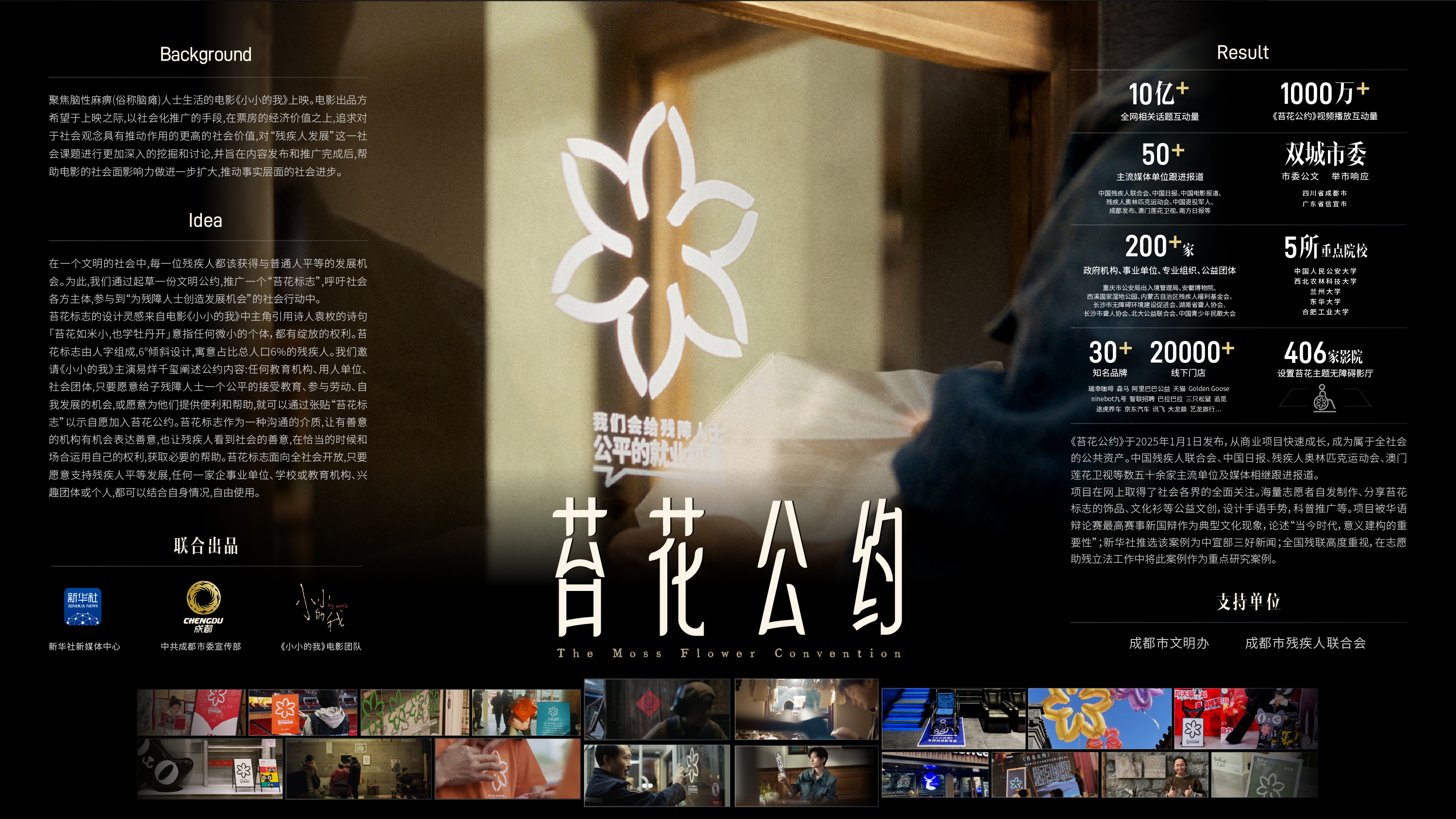 2025年1月1日,由蓝色共鸣策划,新华社新媒体中心、成都市委宣传部及《小小的我》电影团队联合出品,旨在推动社会各界为残疾人提供公平机会和帮助的文明公约——《苔花公约》正式推出。