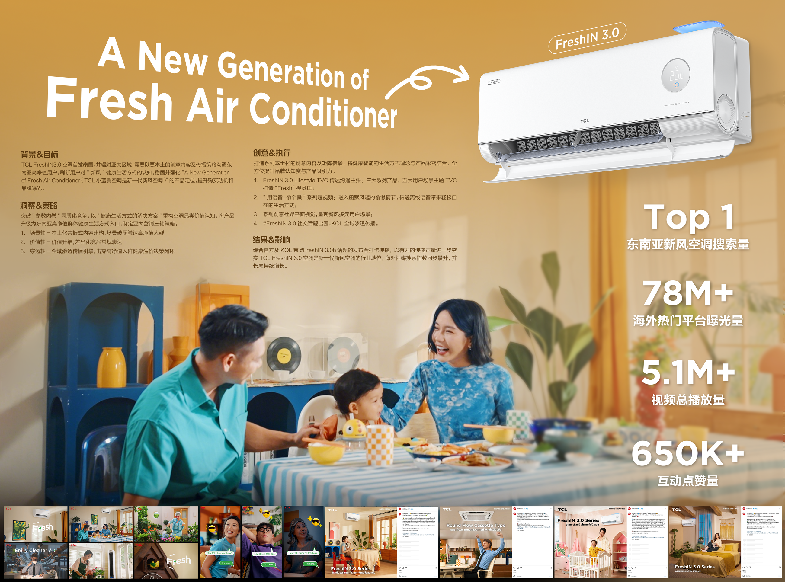 围绕FreshIN 3.0 新风空调“A New Generation of Fresh Air Conditioner”的全球产品定位,突破"参数内卷"同质化竞争,以"健康生活方式的解决方案"重构空调品类价值认知,将产品升级为东南亚高净值群体健康生活方式入口,制定亚太营销三轴策略:场景轴(本地化适配)、价值轴(差异化价值)、穿透轴(全域渗透传播):