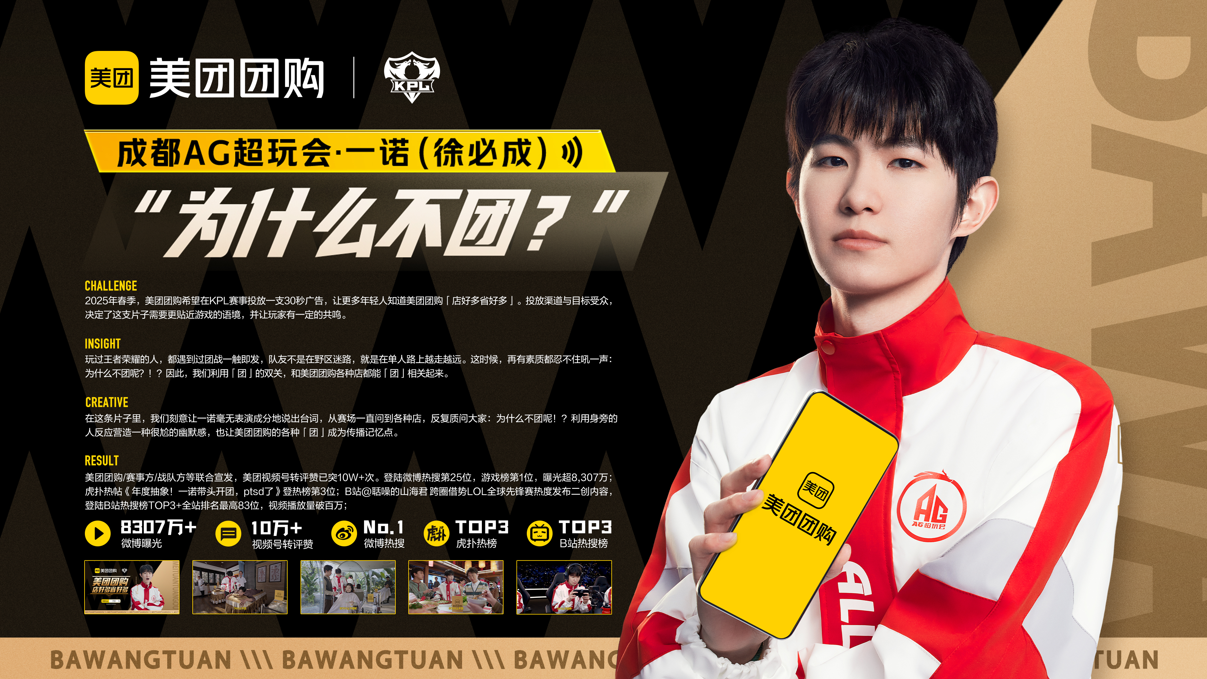美团团购/赛事方/战队方等联合宣发,美团视频号转评赞已突10W+次。登陆微博热搜第25位,游戏榜第1位,曝光超8,307万;虎扑热帖《年度抽象!一诺带头开团,ptsd了》登热榜第3位;B站@聒噪的山海君 跨圈借势LOL全球先锋赛热度发布二创内容,登陆B站热搜榜TOP3+全站排名最高83位,视频播放量破百万。
