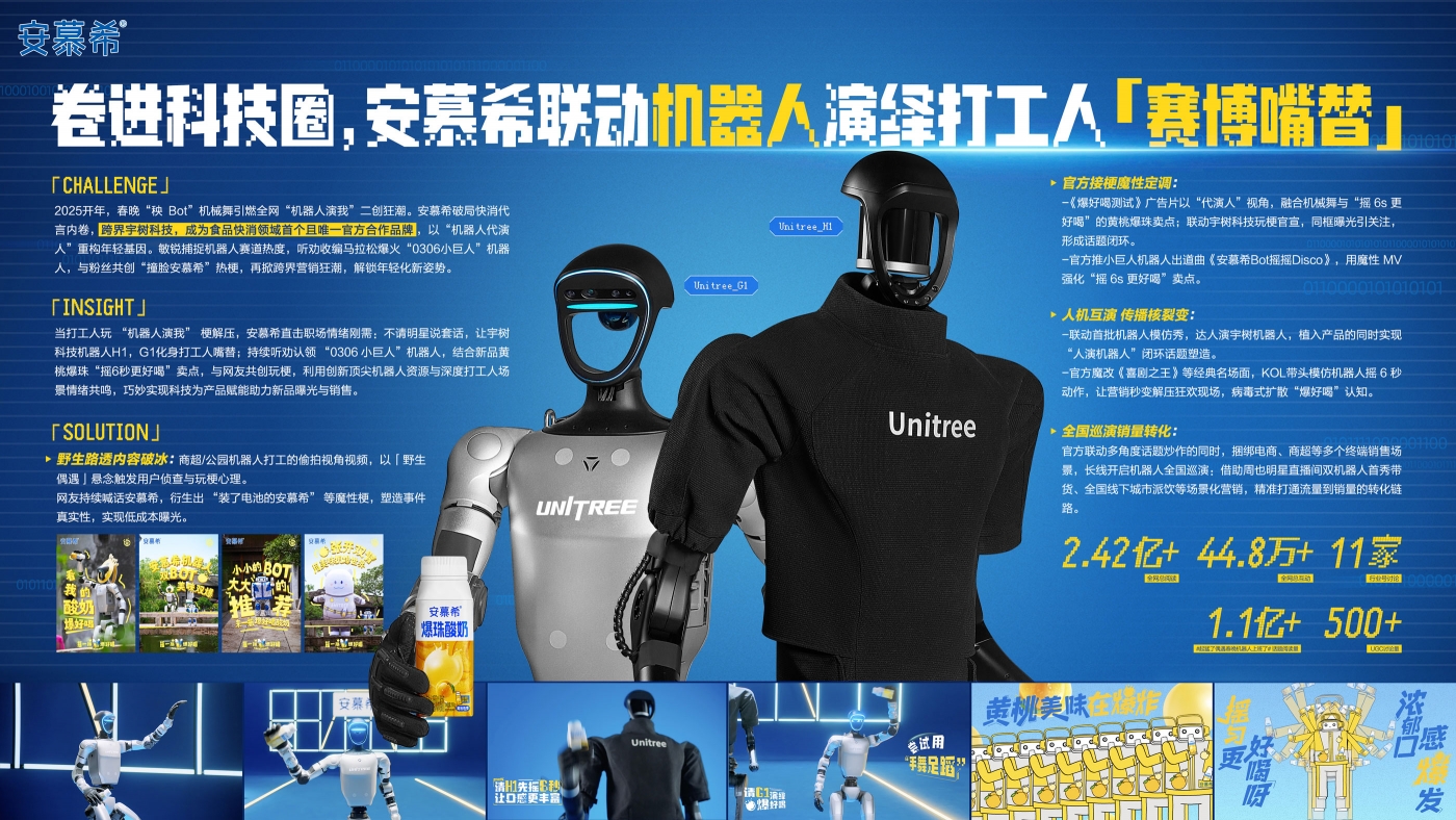 当快消营销深陷明星代言同质化泥潭时,安慕希敏锐捕捉到双重核心需求:一是年轻消费者对科技元素的天然好奇,春晚 “秧 Bot” 机械舞与 “0306 小巨人” 机器人的爆火印证了机器人作为社交货币的潜力;二是职场打工人借 “机器人演我” 实现情绪解压的刚性需求,为品牌创造情感连接突破口。让机器人化身为打工人的“嘴替”,用它机械又诙谐的表演,让品牌转变为“情绪共鸣者”,成为年轻人对抗日常压力的“赛博盟友”。