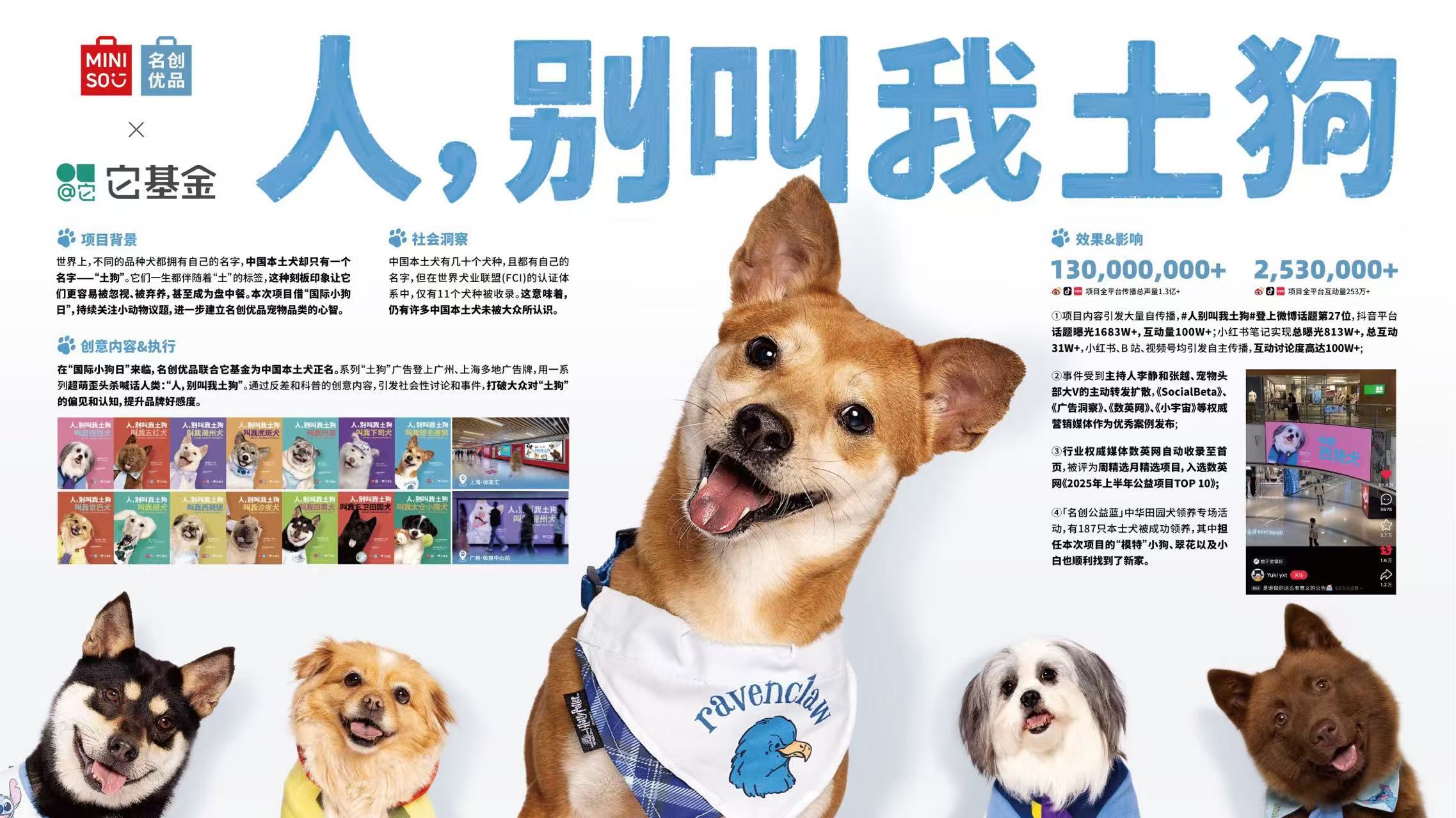 世界上,不同的品种犬都拥有自己的名字,中国本土犬却只有一个名字——“土狗”。它们一生都伴随着“土”的标签,这种刻板印象让它们更容易被忽视、被弃养,甚至成为盘中餐。名创优品从2024 年开始持续进行保护小动物公益项目,在养宠和年轻人群沉淀品牌好感度。本次项目借“国际小狗日”,持续关注小动物议题,进一步建立名创优品宠物品类的心智。