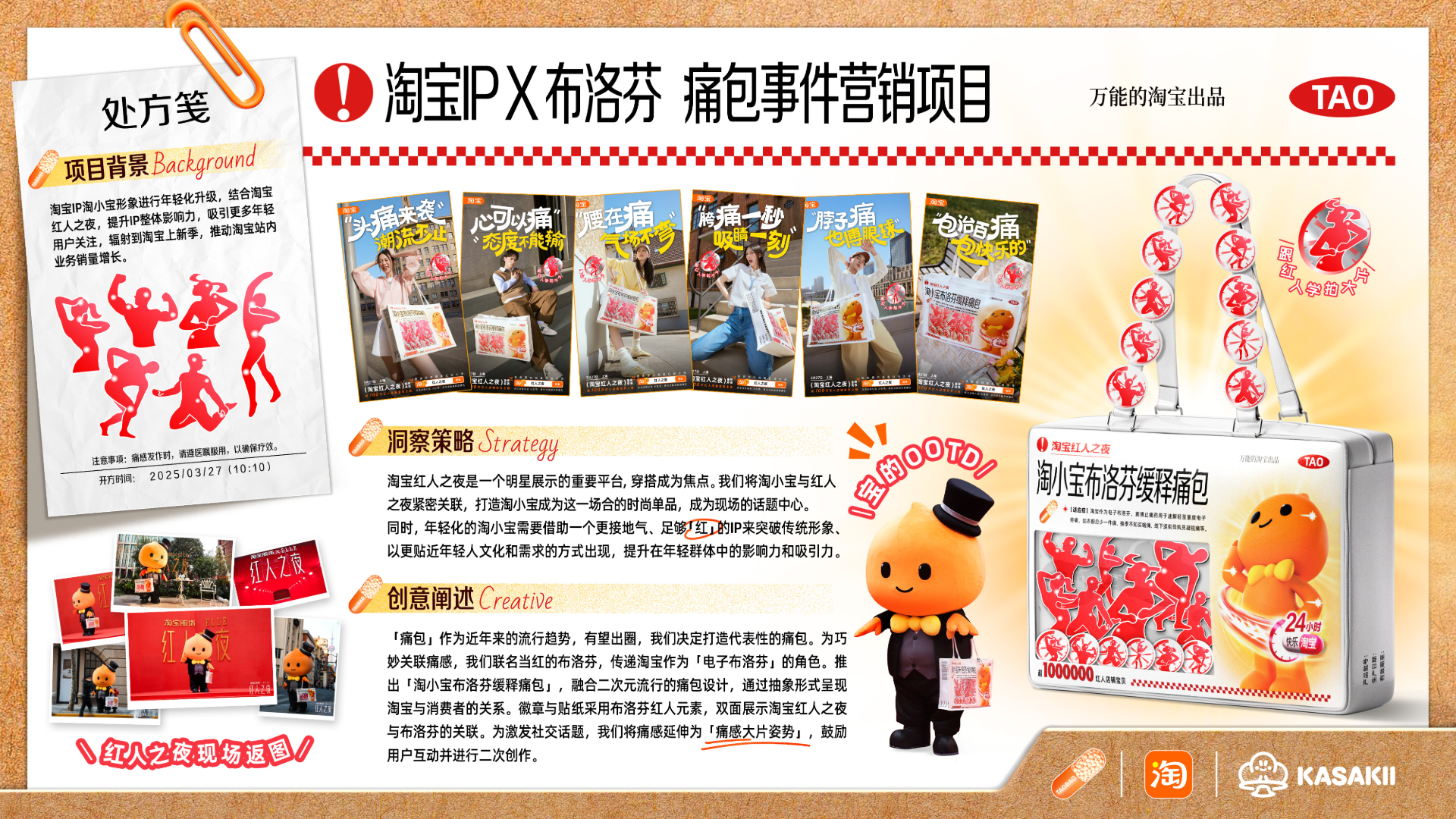 一个爆红的好创意就这样「痛」出来了:「淘宝IP淘小宝布洛芬缓释痛包」,通过极具年轻群体social话题性的创意方式,在红人之夜让淘小宝蜕变成年轻人必备的新一代潮流单品!结合布洛芬小红人形象打造「痛感」徽章及贴纸,增加痛包可玩性及话题度。同时我们将痛感延展成「痛感大片姿势」,释出系列海报,打造年轻人群社交端热点话题,让淘小宝「红到发痛」!
