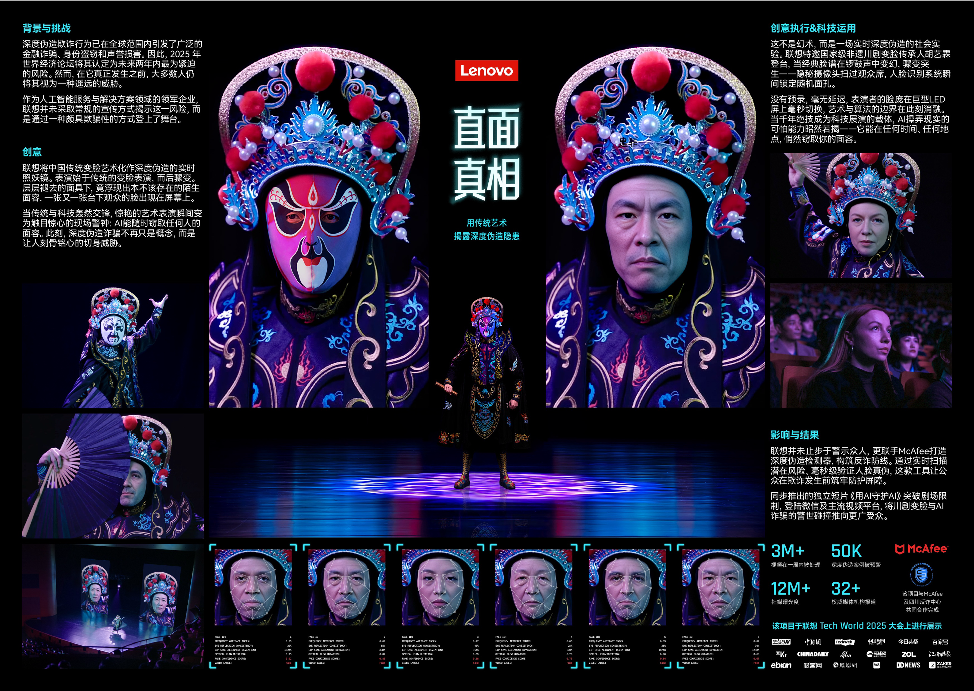 基于对中国丰富的艺术遗产和日益增长的数字安全问题的深刻文化洞察。联想利用标志性的变脸艺术来唤起观众的熟悉感和惊喜感,借助传统艺术的吸引力来吸引观众,同时解决当今的深度伪造欺诈问题。采用实时人工智能技术的决定,是为了应对人们对数字身份实时被操纵的日益担忧。