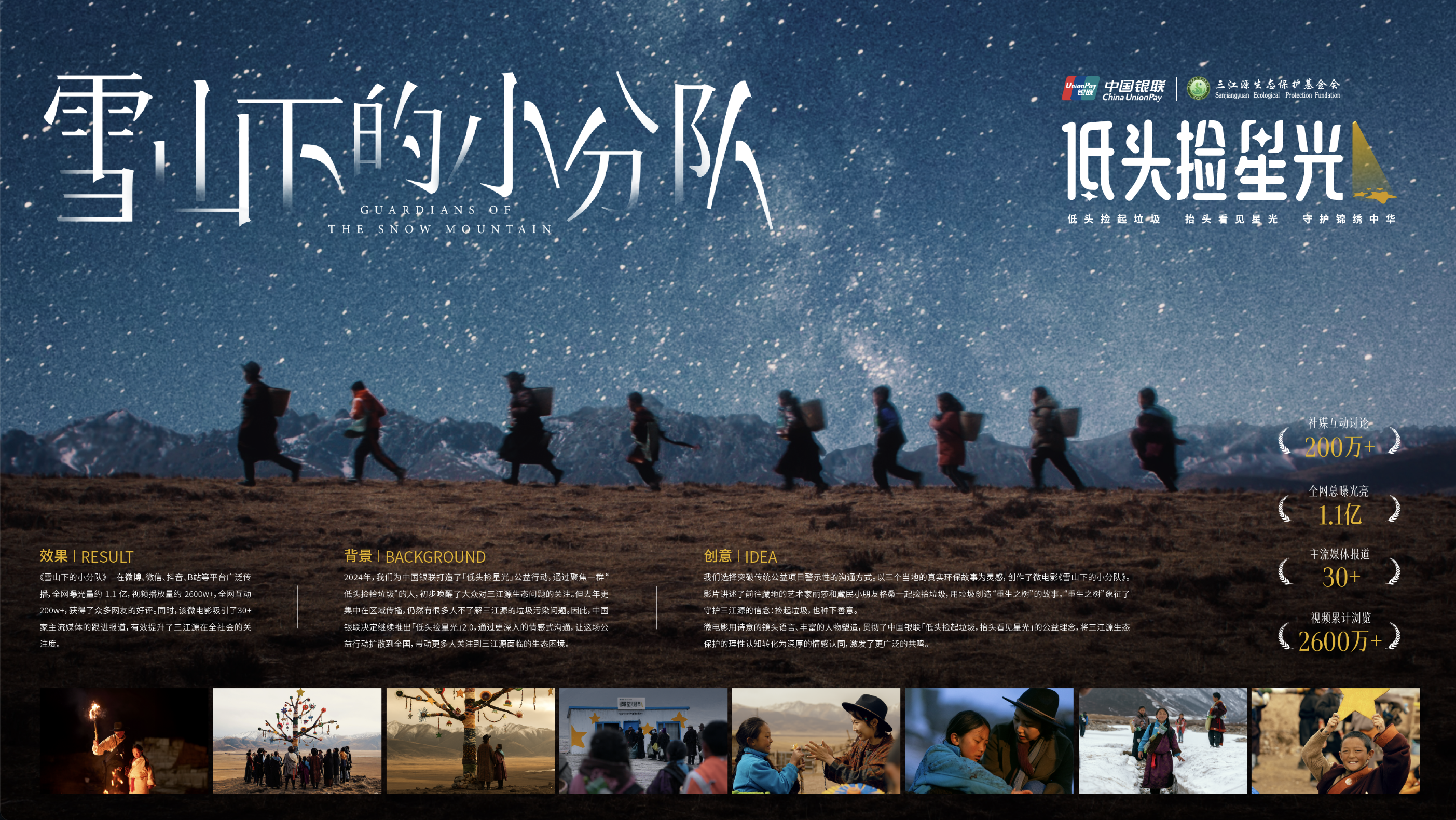 2024年,我们发现三江源有一群“心中有星光”的环保参与者,他们自发参与捡拾地上的垃圾,让三江源重回洁净。为此我们聚焦这群人的故事,打造了公益行动「低头捡星光」,通过一支改编自当地真实环保故事的公益短片、一场用垃圾重塑的公益体验事件「捡来的艺术展」、一个帮助当地人用垃圾兑换梦想物资的「银联星光超市」这三件事初步唤醒了公众对三江源生态问题的关注。