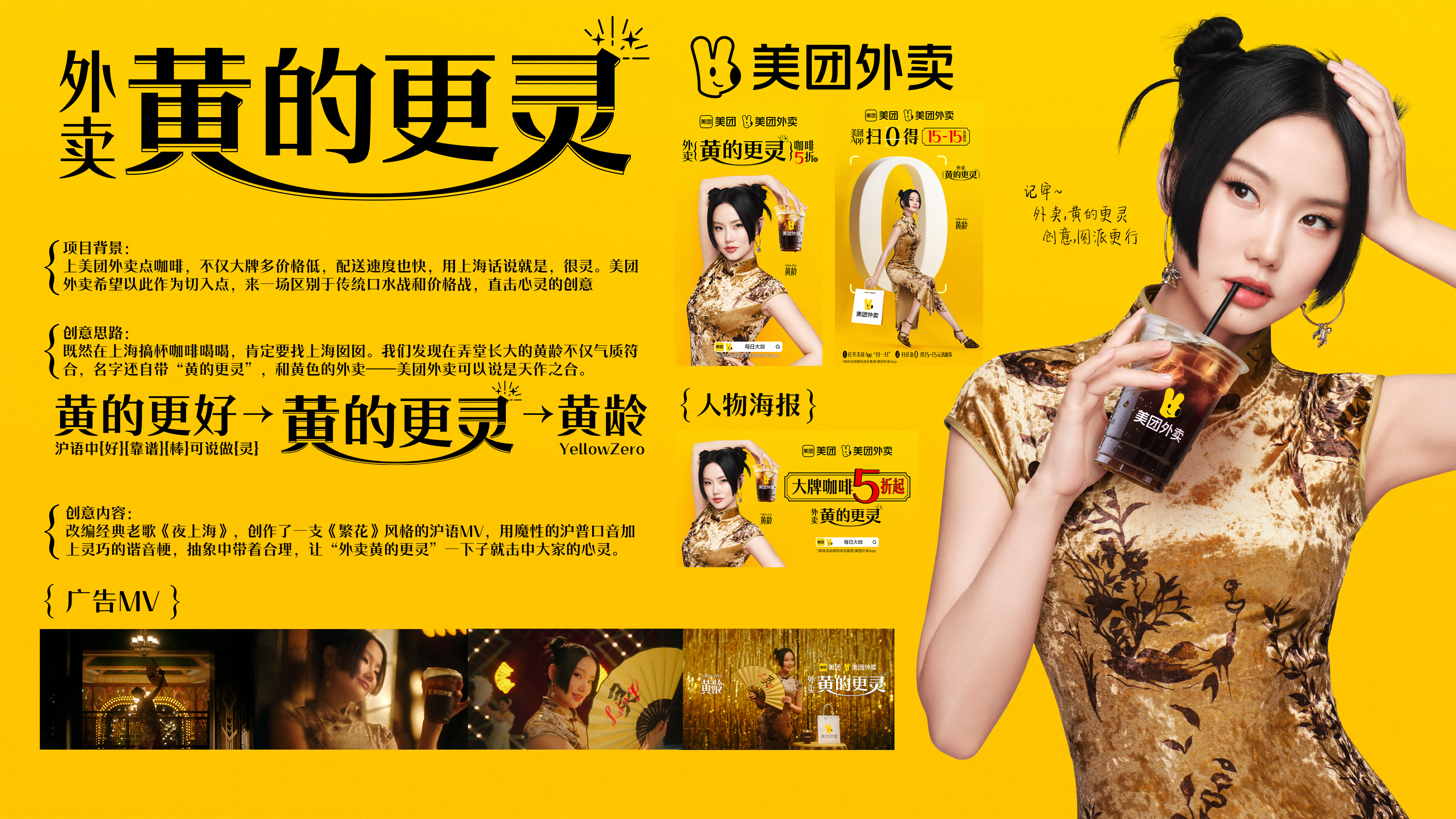 上海歌⼿⻩龄名字与美团外卖品牌完美契合,⾸先“⻩”与美团外卖品牌⾊相符,其次“龄”字巧妙的嫁接沪语俚语中的“灵”,意指“好,棒,靠谱”,从⽽提炼出此次的传播核⼼“⻩的更灵”。