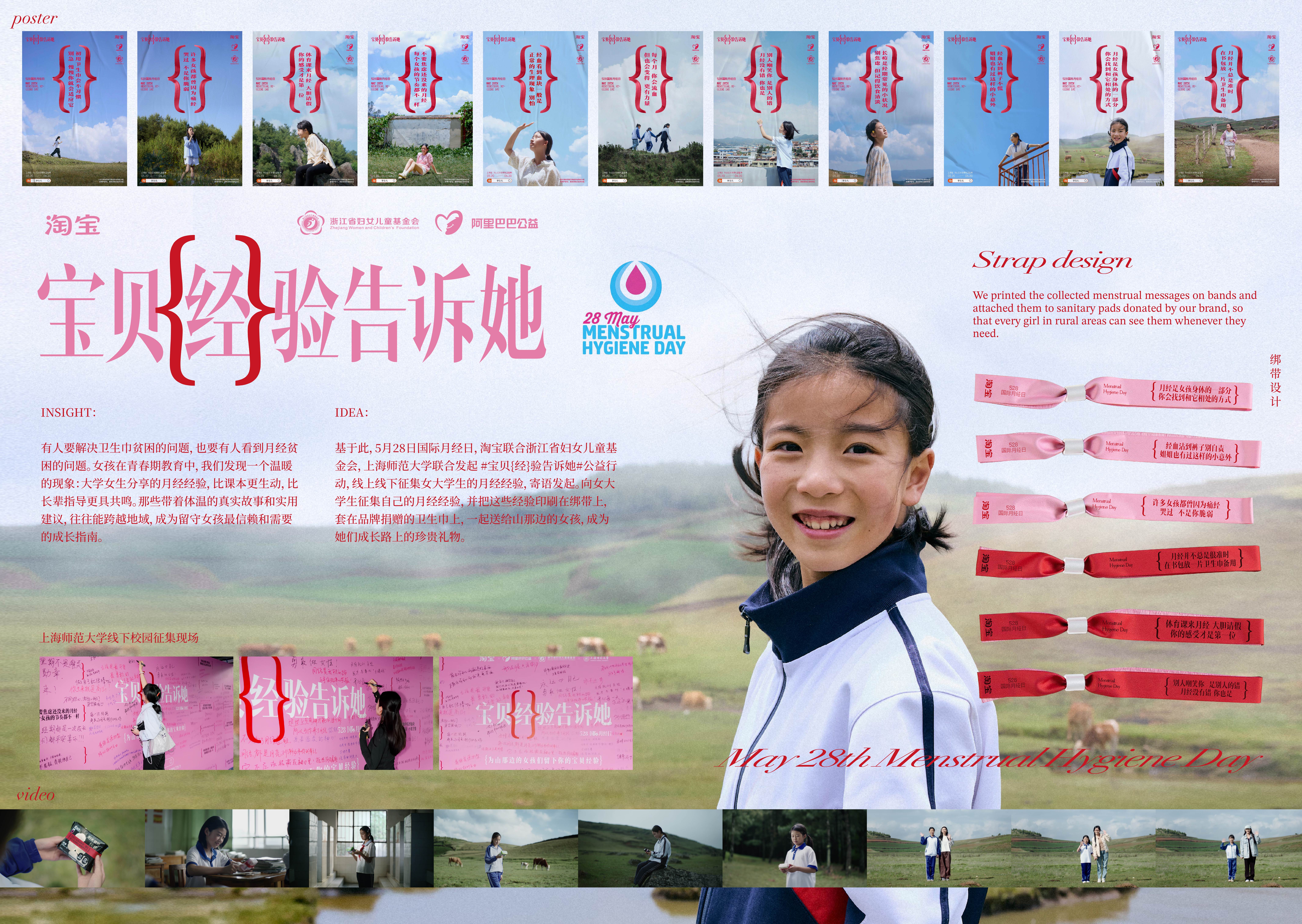 基于此,5月28日国际月经日,淘宝联合浙江省妇女儿童基金会,上海师范大学联合发起#宝贝{经}验告诉她#公益行动,线上线下征集女大学生的月经经验,寄语发起。向女大学生征集自己的月经经验,并把这些经验印刷在绑带上,套在品牌捐赠的卫生巾上,一起送给山那边的女孩,成为她们成长路上的珍贵礼物。