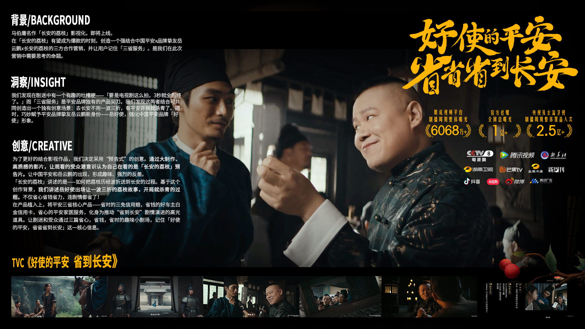 1、剧情创意:围绕“岳好使一出手,开局即杀青”展开,用一场“荔枝送长安”的还原剧中主线,但反转为因为中国平安的好使服务而“一点都不波折”的省到长安。