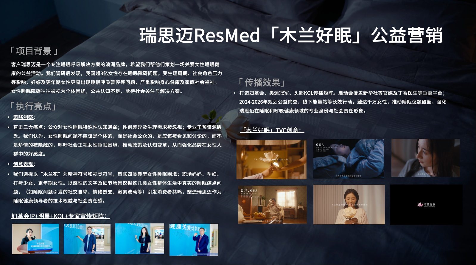 公益短片:我们选择以“木兰花”为精神符号和视觉符号,串联四类典型女性睡眠困境:职场妈妈、孕妇、打鼾少女、更年期女性。以感性的文字及细节场景挖掘这几类女性群体生活中真实的睡眠痛点问题,(如睡眠问题引发的社交自卑、情绪透支、激素波动等)引发消费者共鸣,塑造瑞思迈作为睡眠健康领导者的技术权威与社会责任感。