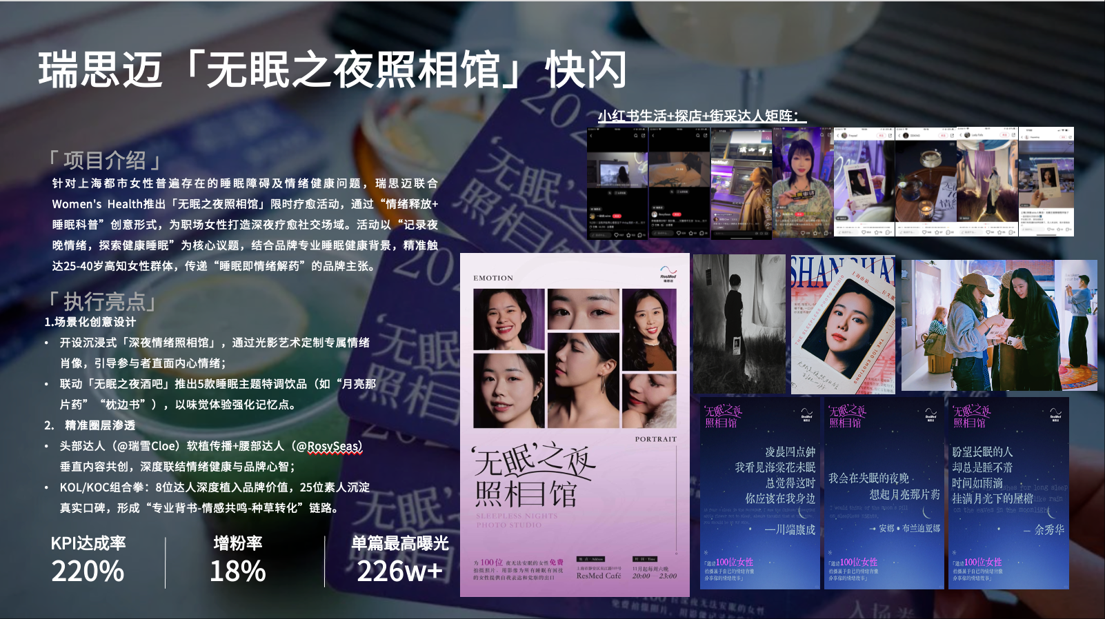 品牌资产沉淀:仅通过非常小的预算,在小红书上获得100w+笔记点击,同时获得近百篇自来水探店打卡笔记,「无眠之夜照相馆」线下快闪活动为resmed cafe有效引流,kpi完成率达 225%。