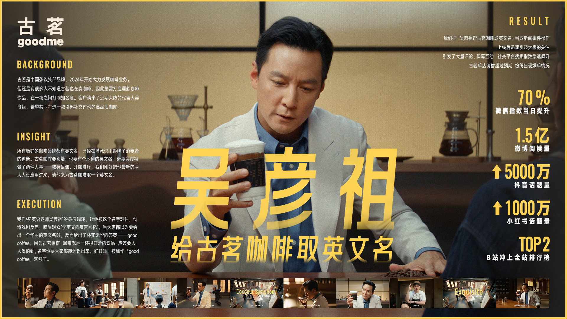 1、敢于让艺人“喧宾夺主”,推动创意内容事件化:代言人营销需要考虑艺人与品牌角色的平衡,但这一次,基于对爆点的预埋判断、也出于对古茗咖啡产品的自信,我们让好产品甘心当“配角”,将故事话题性聚焦在吴彦祖身上,把「吴彦祖给古茗咖啡取英文名」当成一个“新闻事件”来操作。