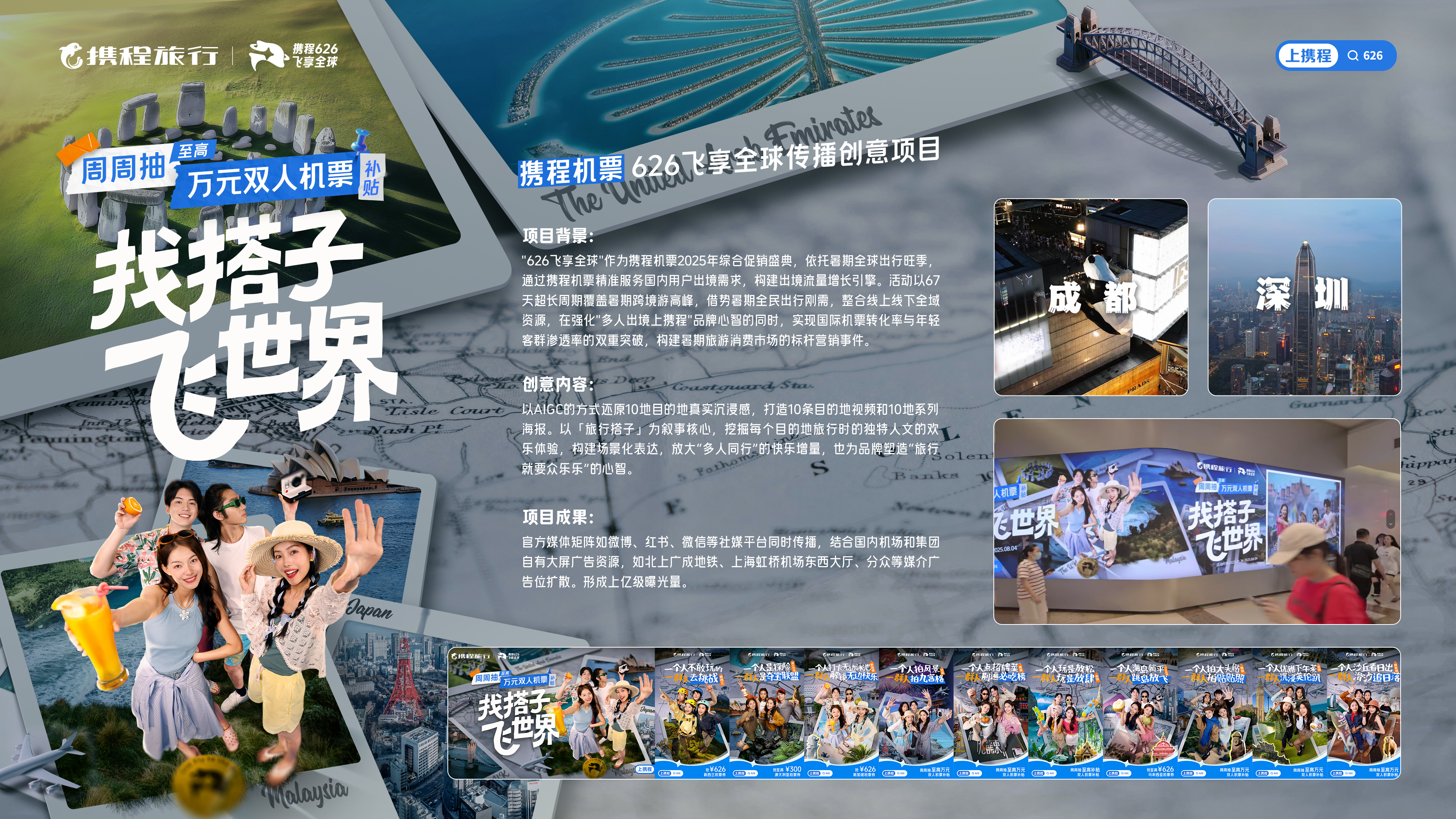 携程机票借势2025暑期出行高峰,打造“626飞享全球”大促,精准服务出境需求。活动以“多人出境上携程”强化品牌心智,同步提升国际机票转化率与年轻客群占比,树立暑期旅游营销标杆。